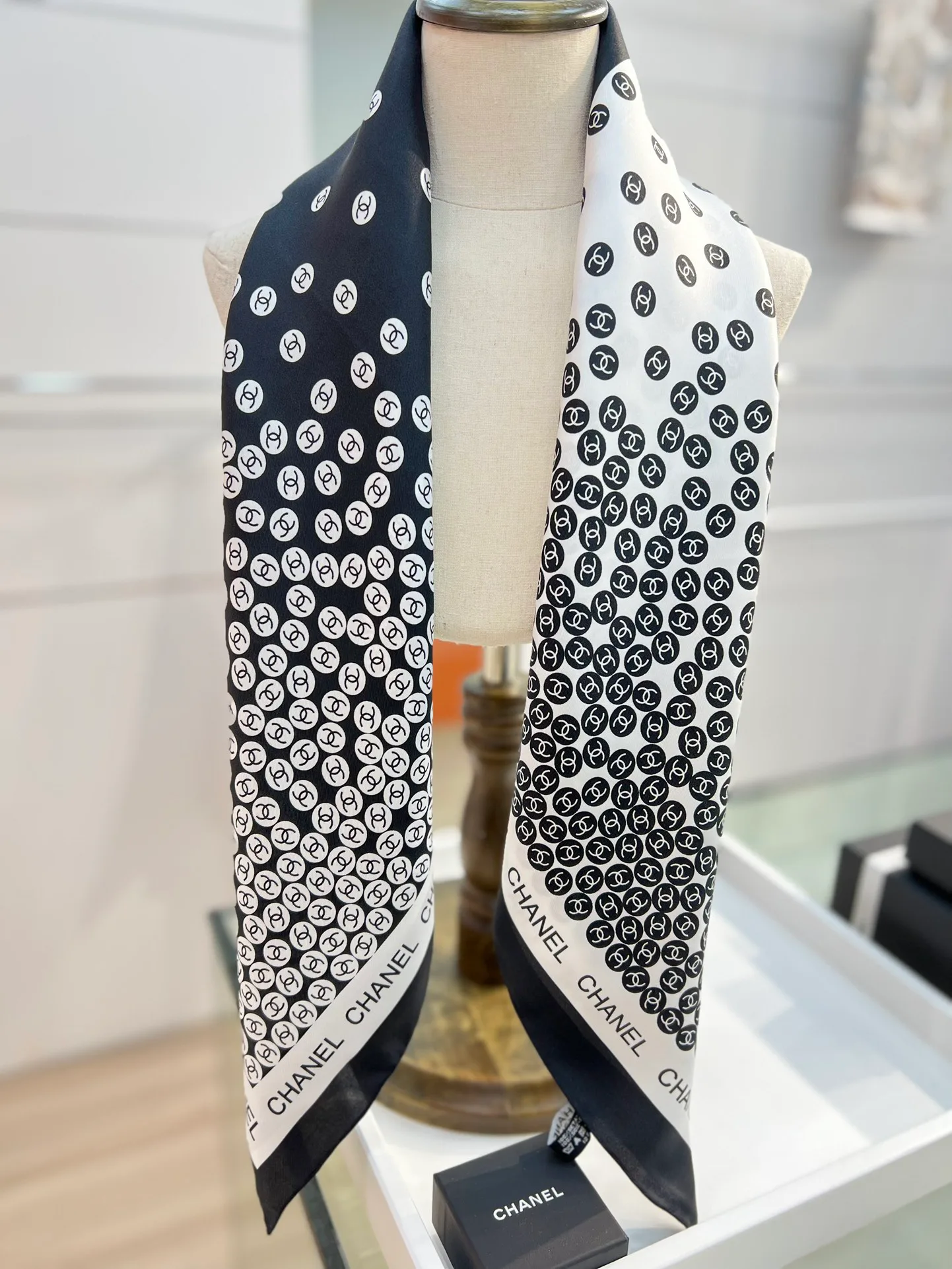 Логотип бренда CHANEL, украшающий края платка, подчеркивает высокое качество и внимание к деталям. Это идеальный аксессуар, который подчеркнет вашу индивидуальность и создаст завершенный образ. Платок можно использовать как акцент в повседневной одежде или дополнение к более формальным нарядам, придавая им оригинальность и шарм.