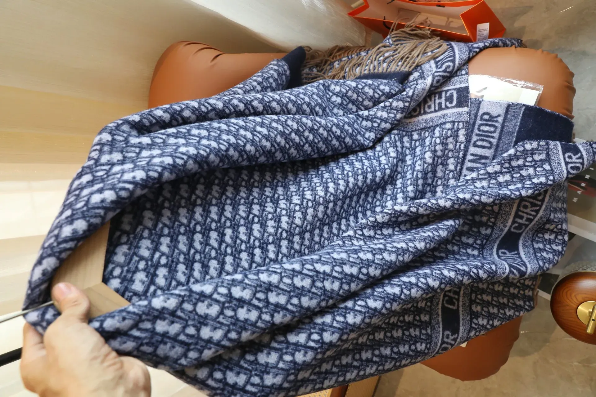 Платок представлен в насыщенном синем цвете, который привлекает внимание и легко комбинируется с различными нарядами. На его поверхности расположен характерный для CHRISTIAN DIOR узор и повторяющийся логотип бренда, подчеркивающие эксклюзивность и высокое качество изделия.