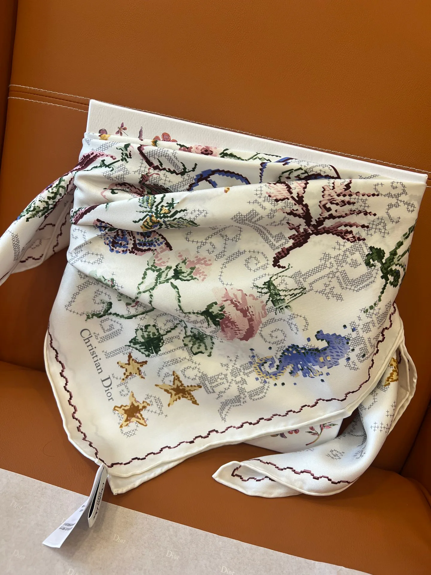 Изготовленный из высококачественного и нежного ивори-цвета шелка, платок выполнен из 100% шелка и отличается высокой износостойкостью. Его поверхность обработана с использованием техники, имитирующей эффект вышивки, что добавляет изделию особую привлекательность и утонченность. Особое внимание уделено деталям: яркие многокрасочные рисунки и ручная обработка краев придают платку изысканный и оригинальный вид.