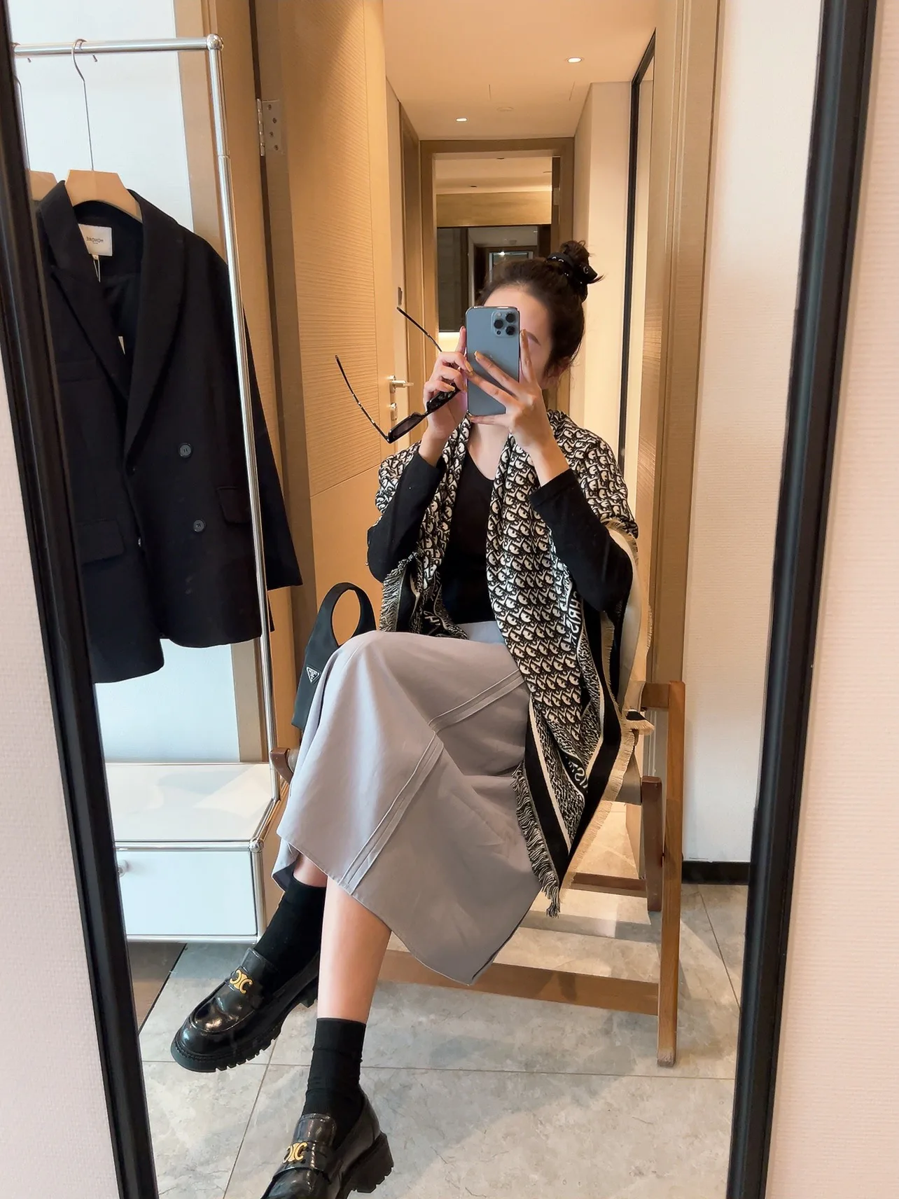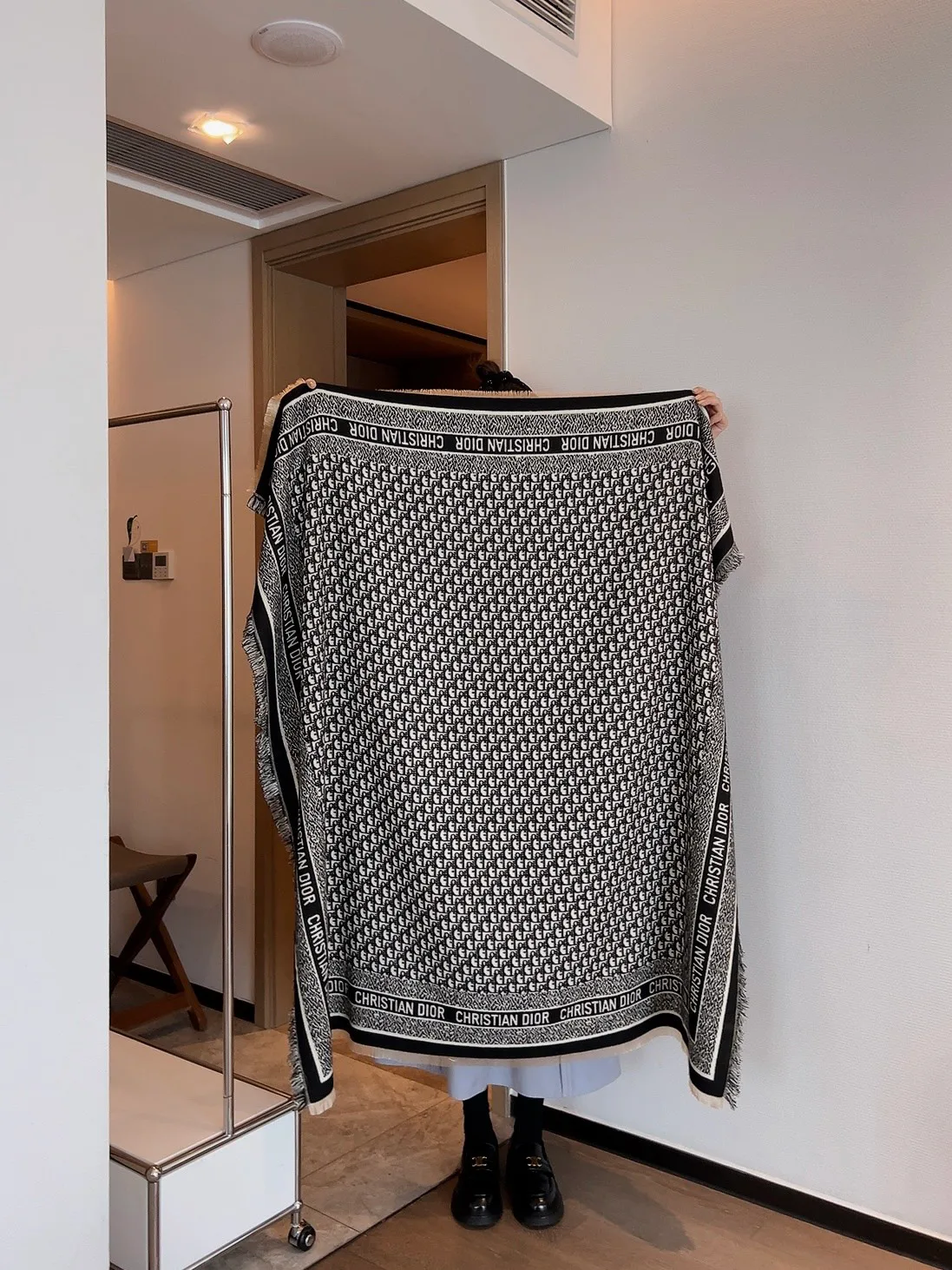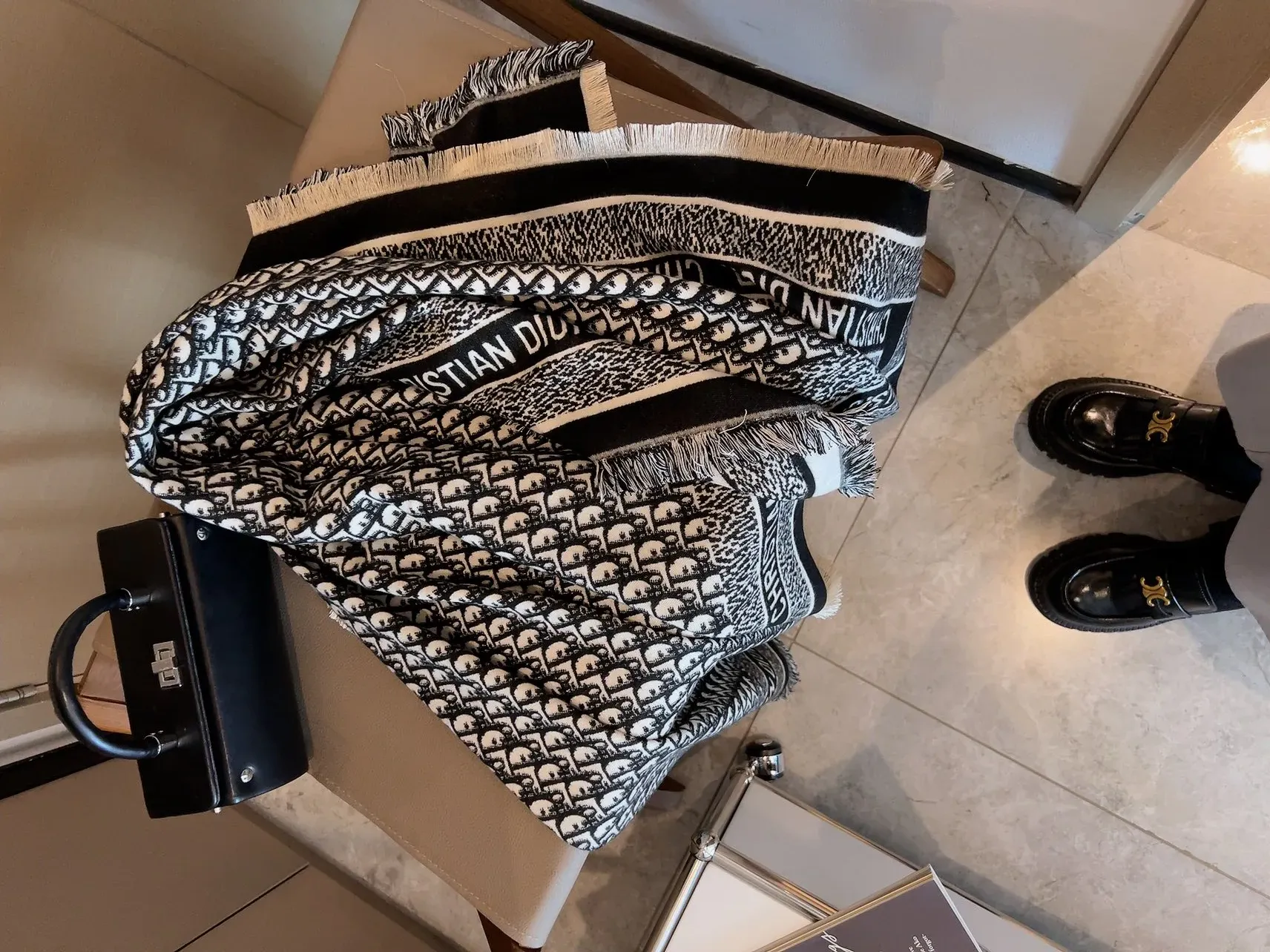 Основной принт представляет собой обновлённую версию легендарного Dior Oblique с характерным узором. Шарф украшен бахромой по краям и контрастной жаккардовой лентой, на которой читается надпись CHRISTIAN DIOR. Ткань обладает прочностью и сохраняет форму, обеспечивая чёткое переплетение рисунка.