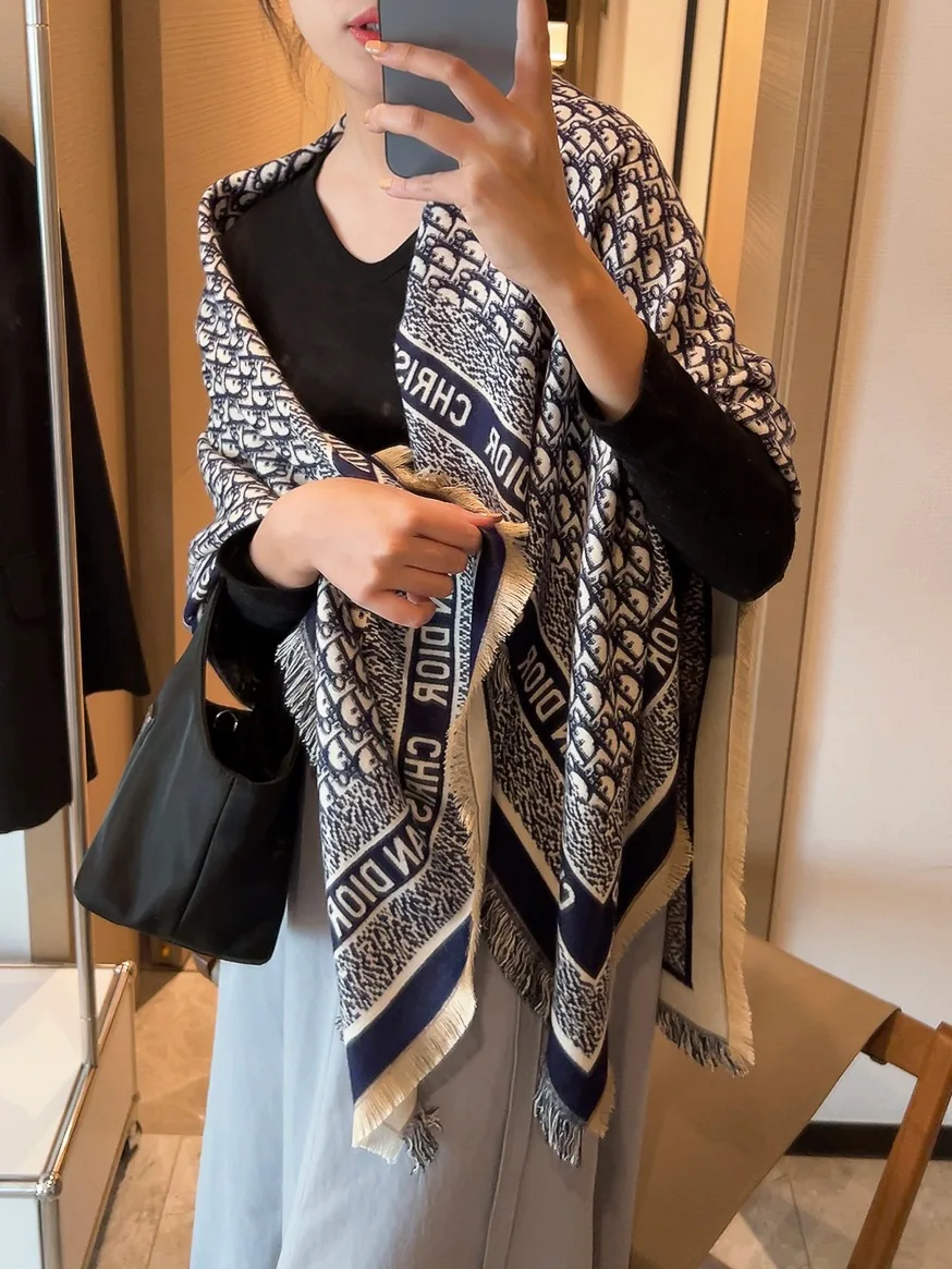 В дизайне шали использован насыщенный узор с аппликацией бахромы и контрастная жаккардовая лента с надписью CHRISTIAN DIOR, что добавляет элегантности. Доступны два цветовых варианта: деним-синий и премиальный серый. Шаль универсальна и подходит для любого времени года, легко сочетается как с классическими, так и с casual-луками.