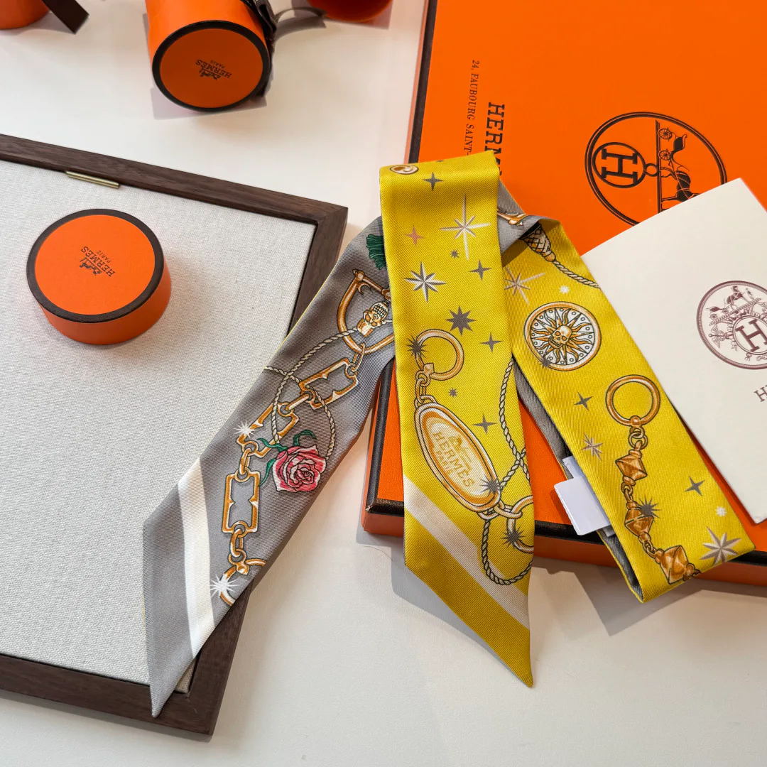 Платки HERMES — аксессуар из 100% двойного шёлка-сатина с двусторонним принтом. Шёлковая лента подходит для ношения на шее, запястье или в качестве пояса, а также для декора сумки. Размер изделия составляет 5 на 86 сантиметров.
