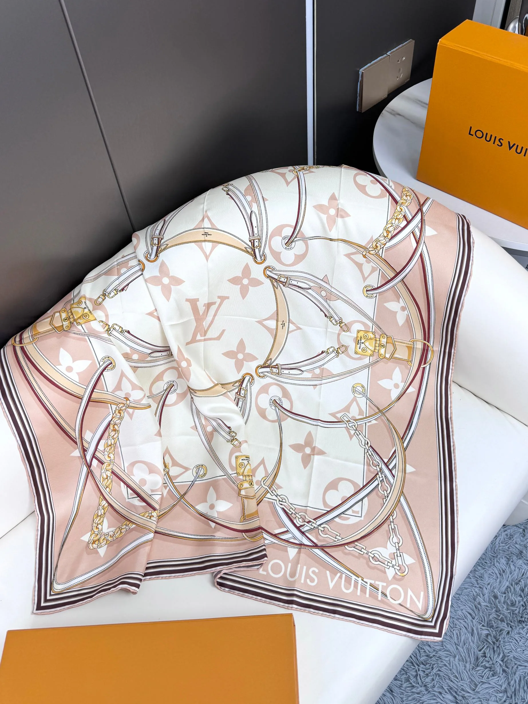 Платок украшен оригинальными элементами, такими как ленты, цепочки и замковые мотивы, которые в совокупности создают стильный цветочный узор Monogram, вдохновленный миром кожаных изделий. Контрастные обрамления добавляют ярких акцентов, делая платок еще более привлекательным и заметным.