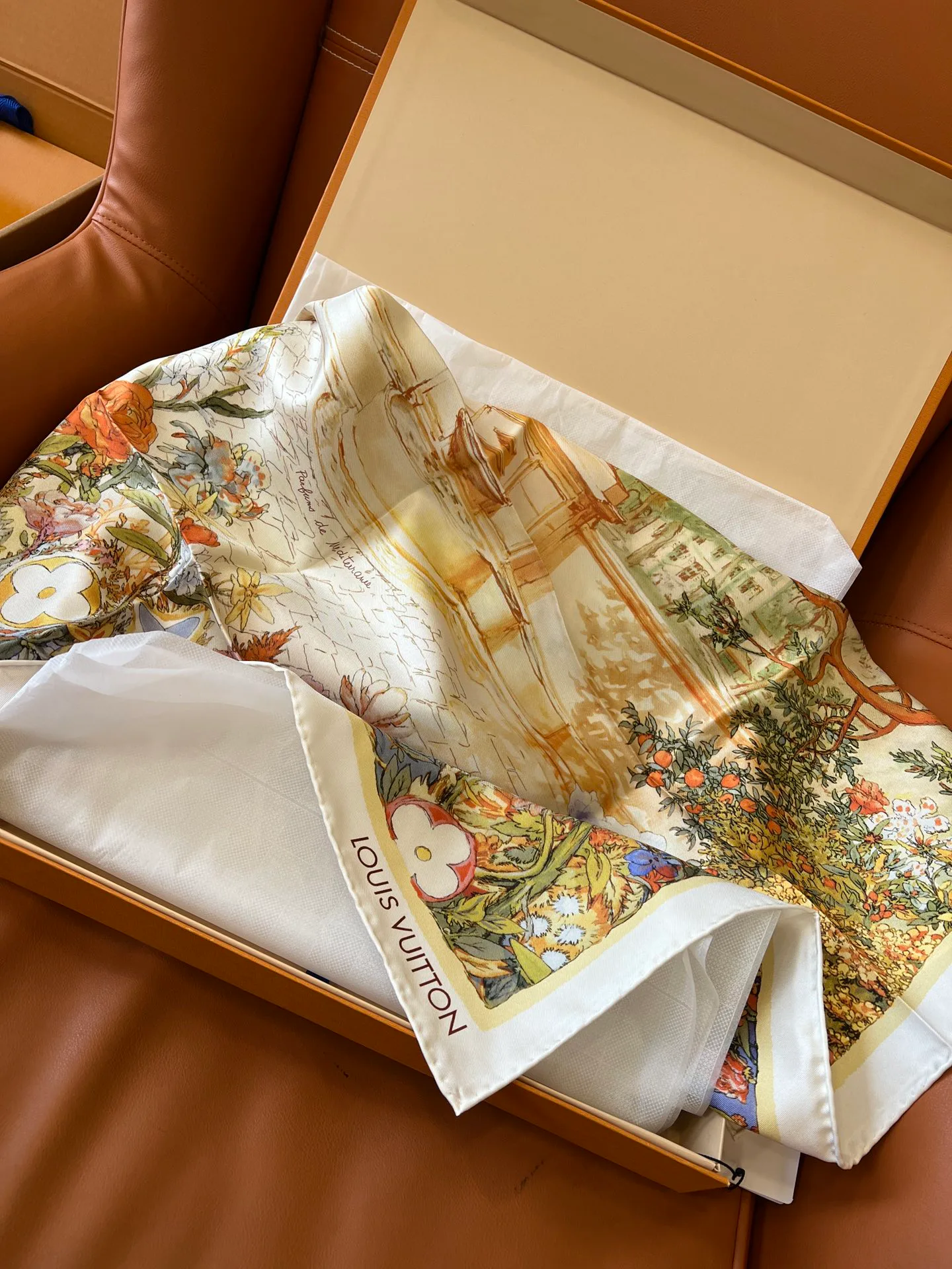 Яркие цветы, изображенные на платке, соперничают с символикой Monogram, создавая гармоничное сочетание традиций и современности. Этот платок является не только модным аксессуаром, но и настоящим произведением искусства, прославляющим знаменитый город Грас — мировой центр парфюмерии и аромата.