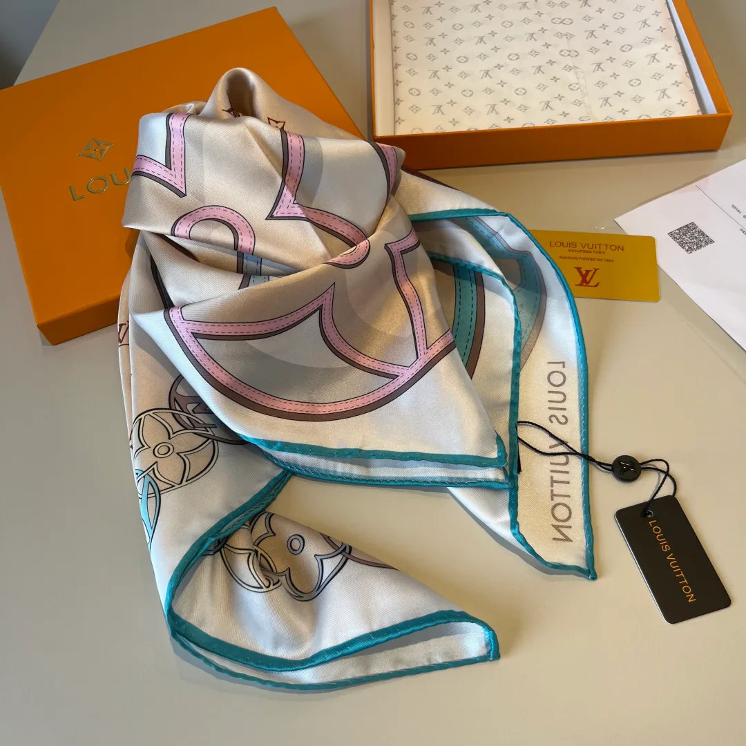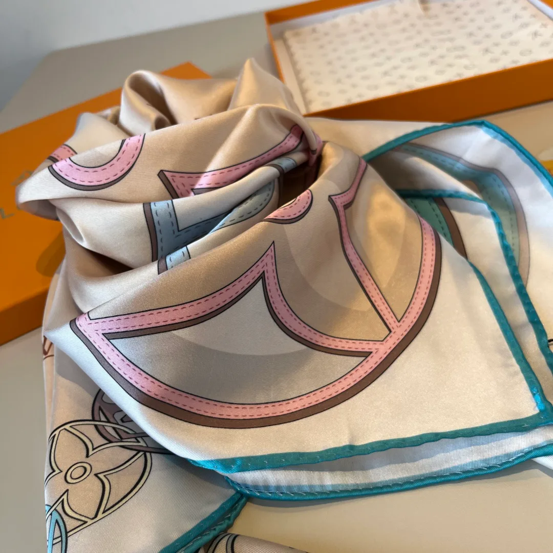 В дизайне платка гармонично сочетаются брендовое монограммное узор и мотивы Monogram Flowers с знаками LV Circle. Это создает ощущение утончённого стиля и современного прочтения классических элементов бренда.