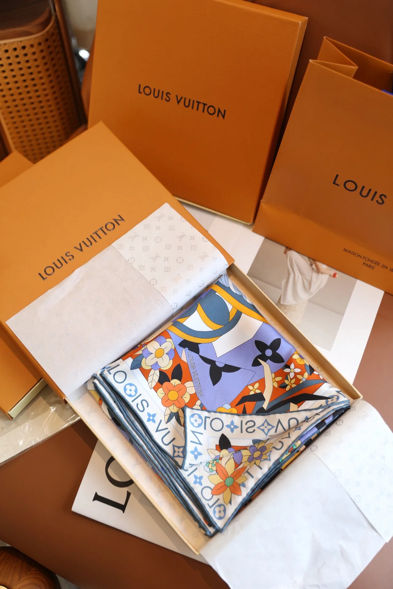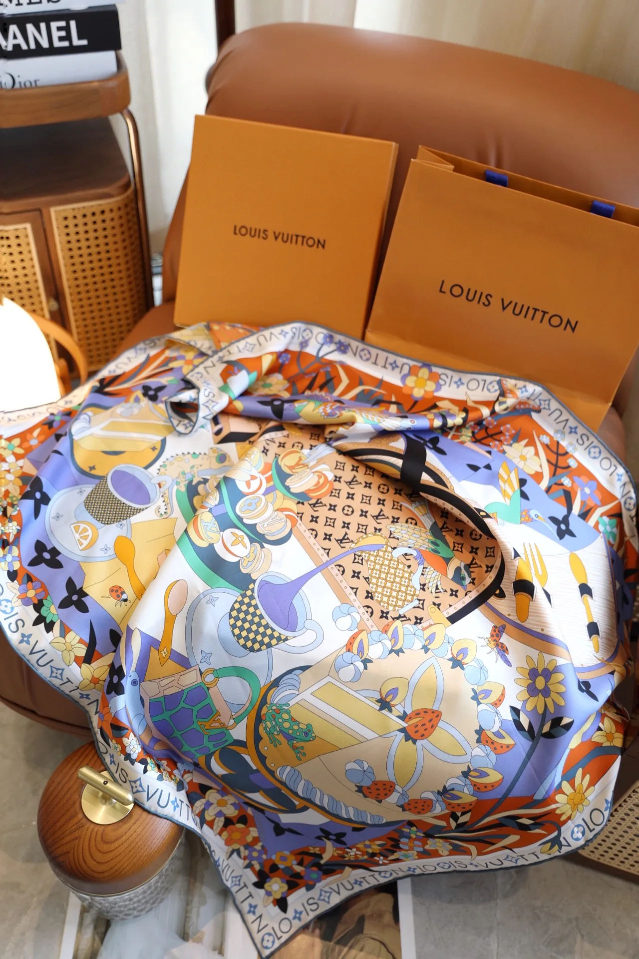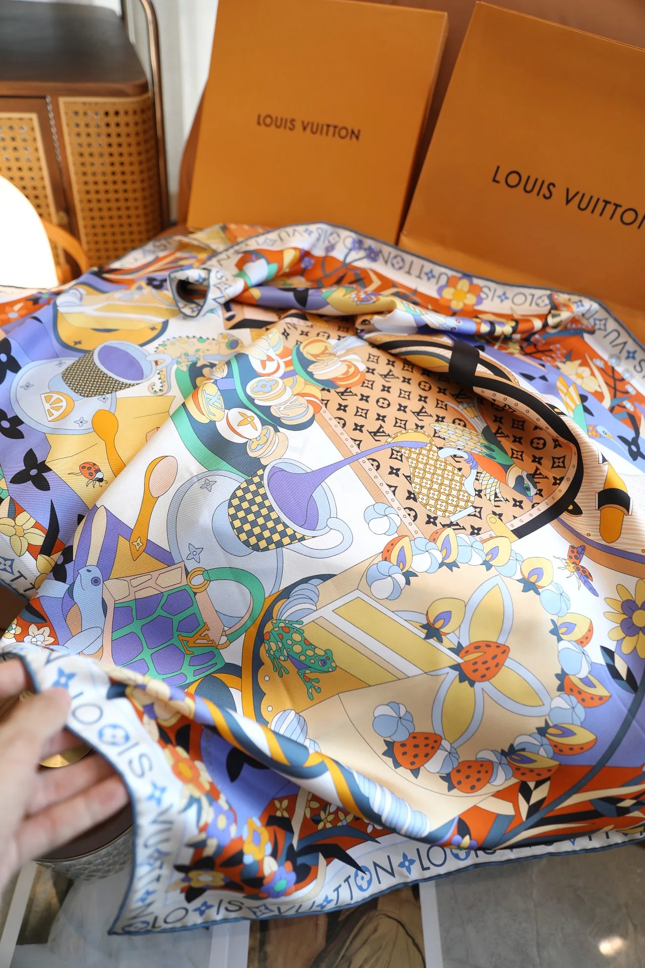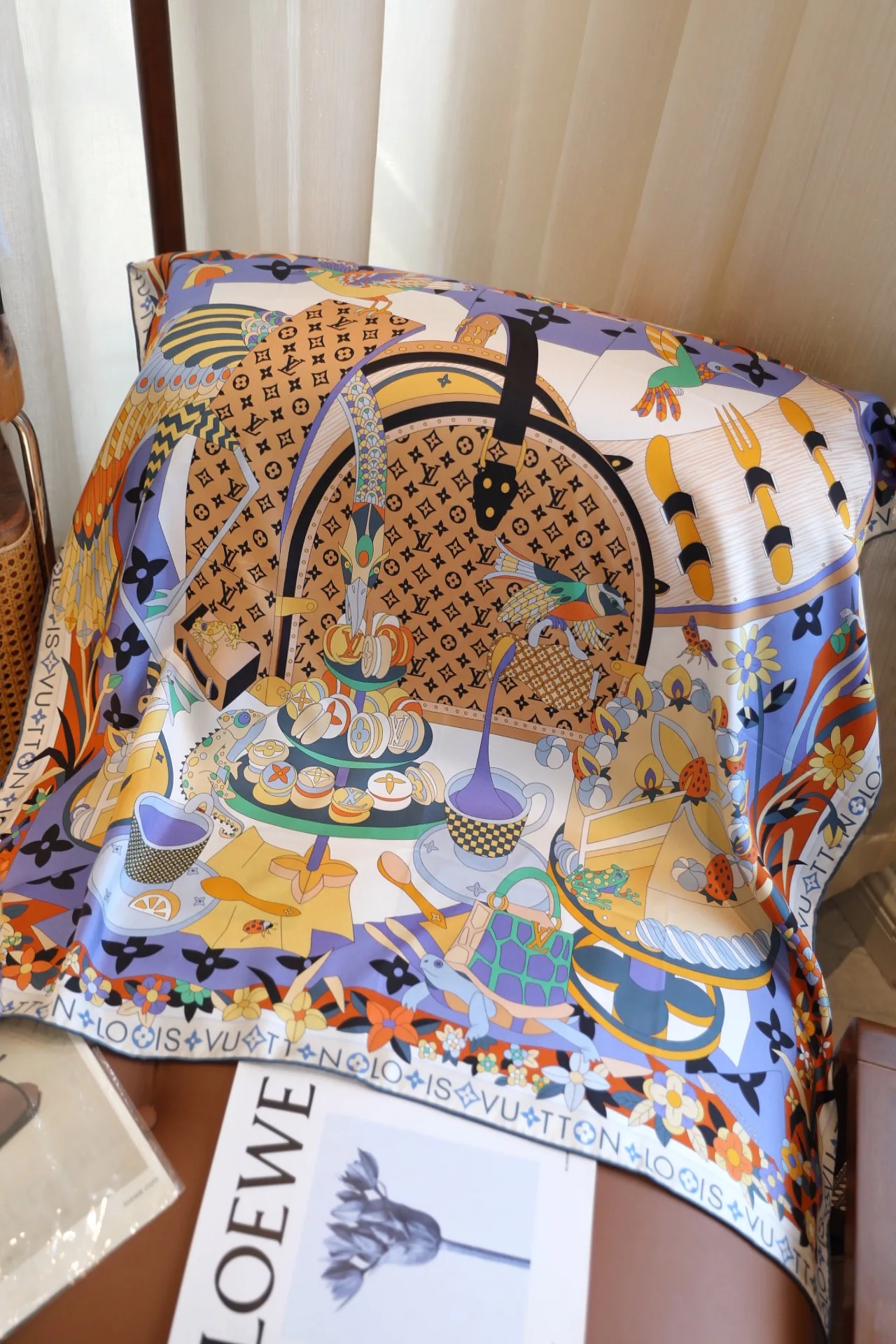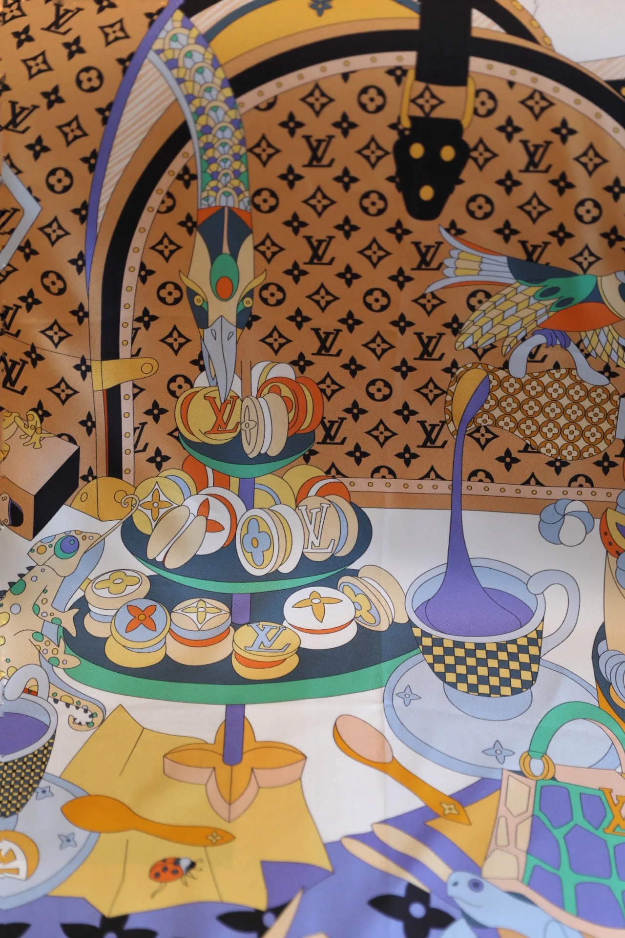 Дизайн и мотив: платок выполнен в духе коллекций Louis Vuitton и вдохновлён Monogram Picnic Hard Case. В мотиве переплетаются элементы природы: птицы, цветы и торты, которые окружают Monogram-линию, создавая современный шарм и игривый креатив.