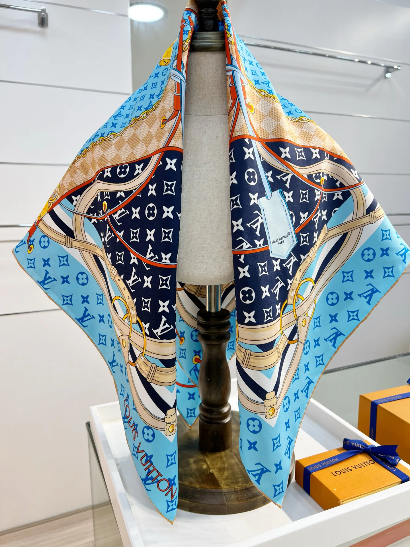 Материал из 18-миллиметрового премиального шелка с двусторонним однотонным дизайном обеспечивает мягкость и приятные тактильные ощущения. На платке изображены элементы эстетики Louis Vuitton: Monogram цветочный узор, декоративные ленты, замочки и бирки для багажа. Эти детали подчеркивают изысканность и современный вид изделия.