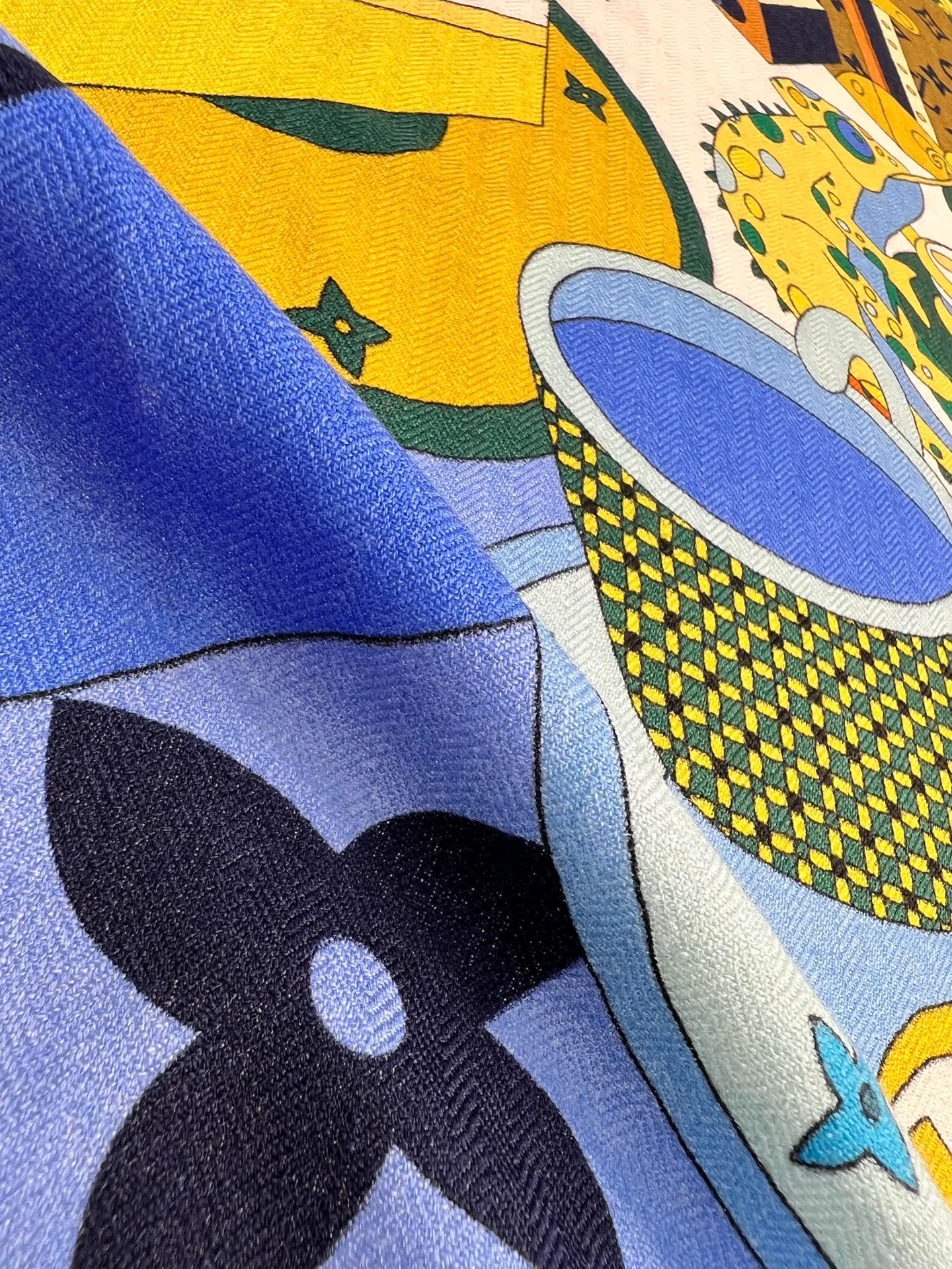 Шаль имеет размеры 136×136 см и изготовлена из 30% натурального шелка и 70% шерсти. Это делает её не только эстетически привлекательной, но и невероятно приятной на ощупь и теплой, что позволяет носить её в различных условиях — от пикника в парке до прогулки по городу.