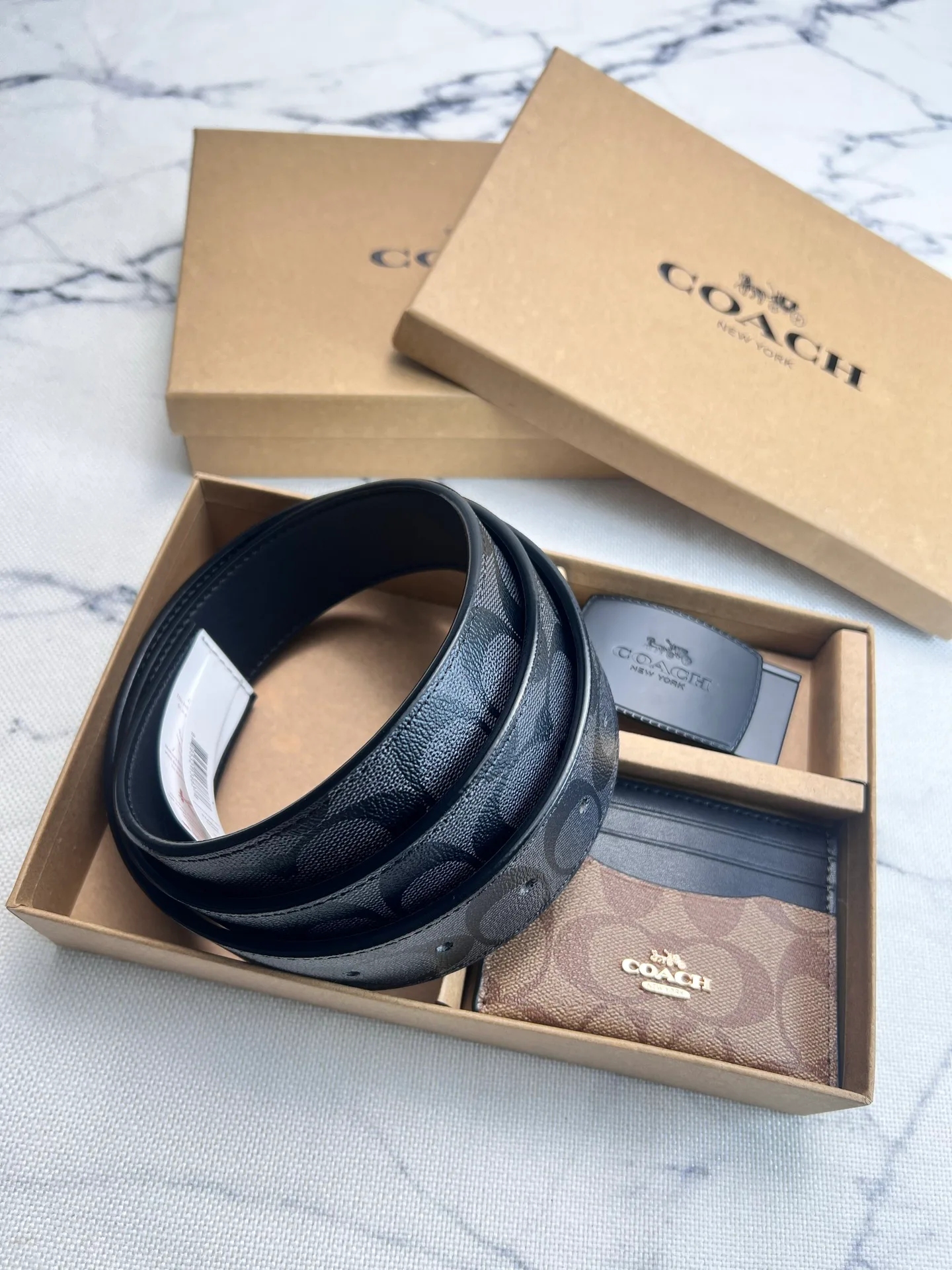 Ремни COACH — мужская кожаная модель ремня с классическим монограммным узором. Длина ремня 120 см, ширина 3,8 см; пряжка одна, ремень можно укоротить. Головку пряжки можно сменить; пряжка вращается на 360 градусов и предусмотрено двустороннее использование. Кардхолдер размером 10×7,5 см с тремя карманами под карты и окном для удостоверения личности. Можно собрать набор для пары; подарок руководителю или близким. В комплект входит полная упаковка по выбору: карта инструкций, пробойник отверстий, пакет и коробка.