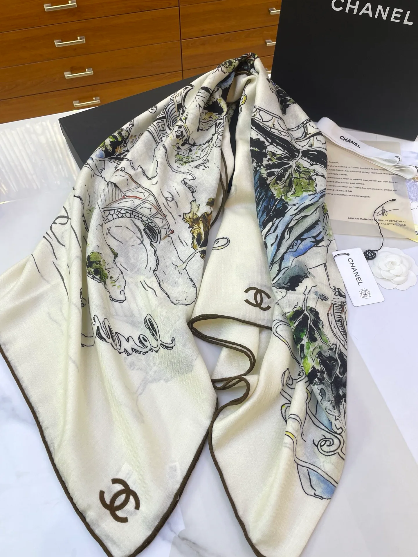 Платок можно носить как стильный аксессуар к верхней одежде или использовать в качестве яркого элемента интерьера. Текстура и дизайн отражают характер бренда CHANEL, сочетая внимание к деталям и оригинальные мотивы.