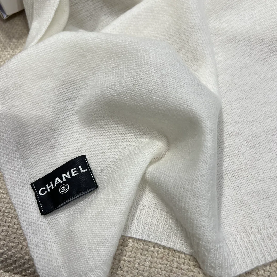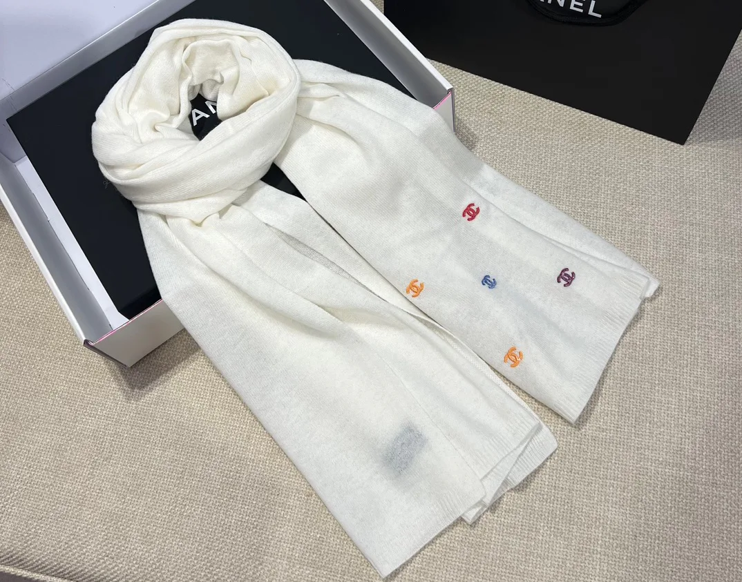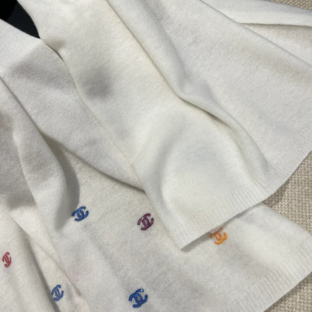 На поверхности шарфа расположена вышивка с двойным логотипом C, дополненная мелкими блестящими элементами. Дизайн создает эффектный и элегантный образ, добавляя глубину и характер деталям. Шарф прекрасно сочетается с пальто, куртками и другой зимней одеждой, придавая образу нотки aristocratic chic.