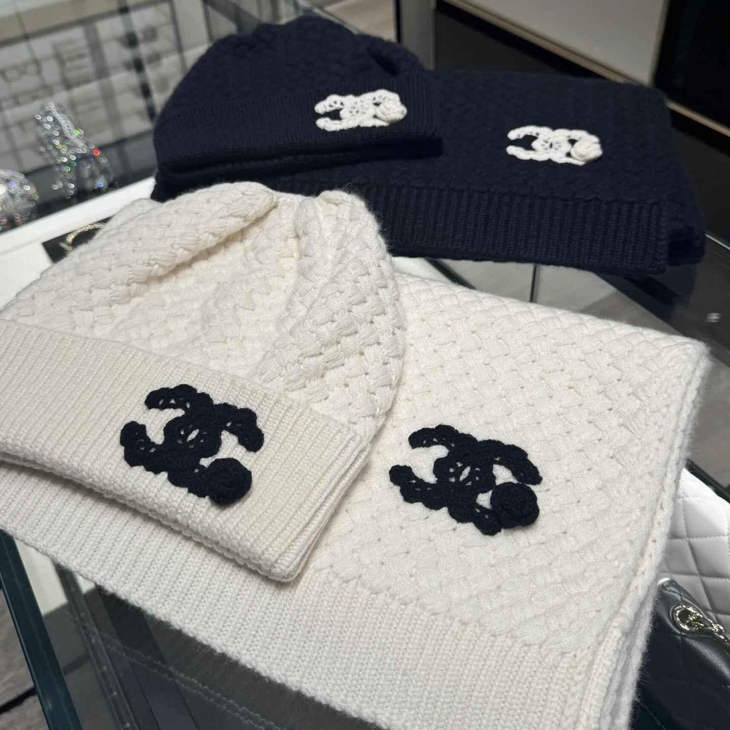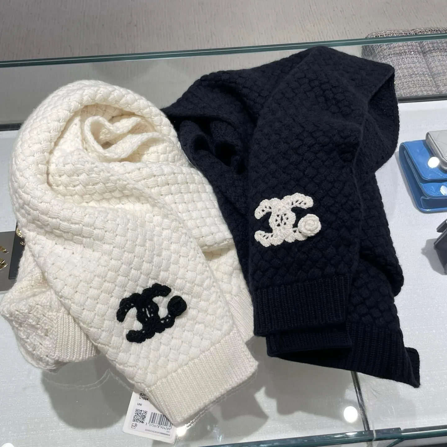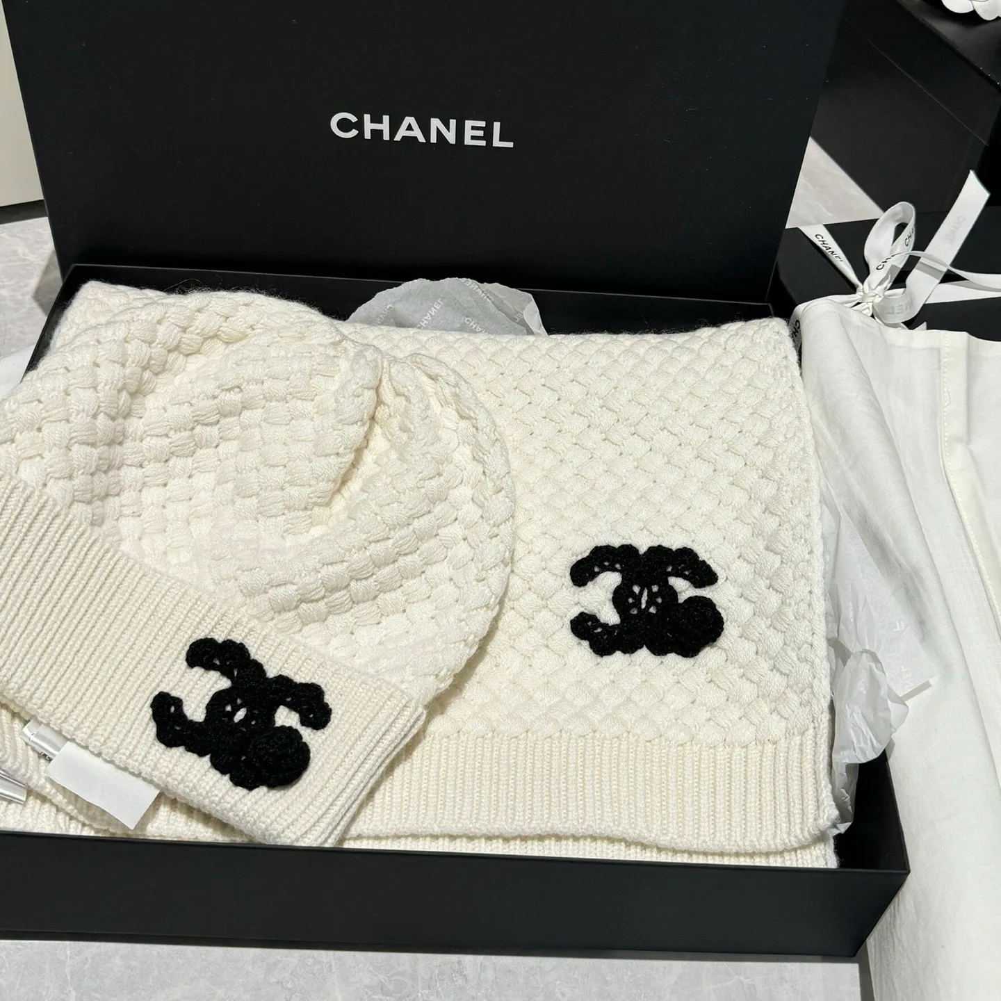 Комплект и стиль: набор состоит из шарфа и шапки, создаёт тёплый образ на холодный сезон. Ориентирован на ценителей CHANEL.
