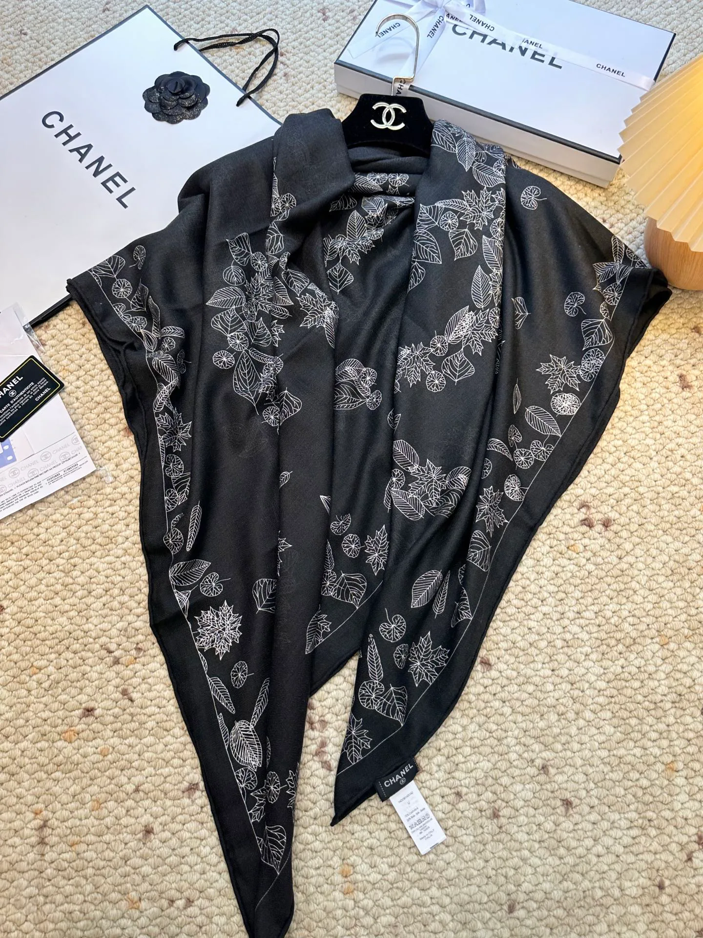 Шарф CHANEL — бархатистый большой квадратный шарф с мотивом камелии и духом Coco. Материал мягкий и гладкий, с прочной фактурой и устойчивостью к зацеплениям. Это серия текущего сезона. Классический черно-белый рисунок. Размер 140 × 140 см. На образах с одеждой, обувью и сумками выглядит элегантно.