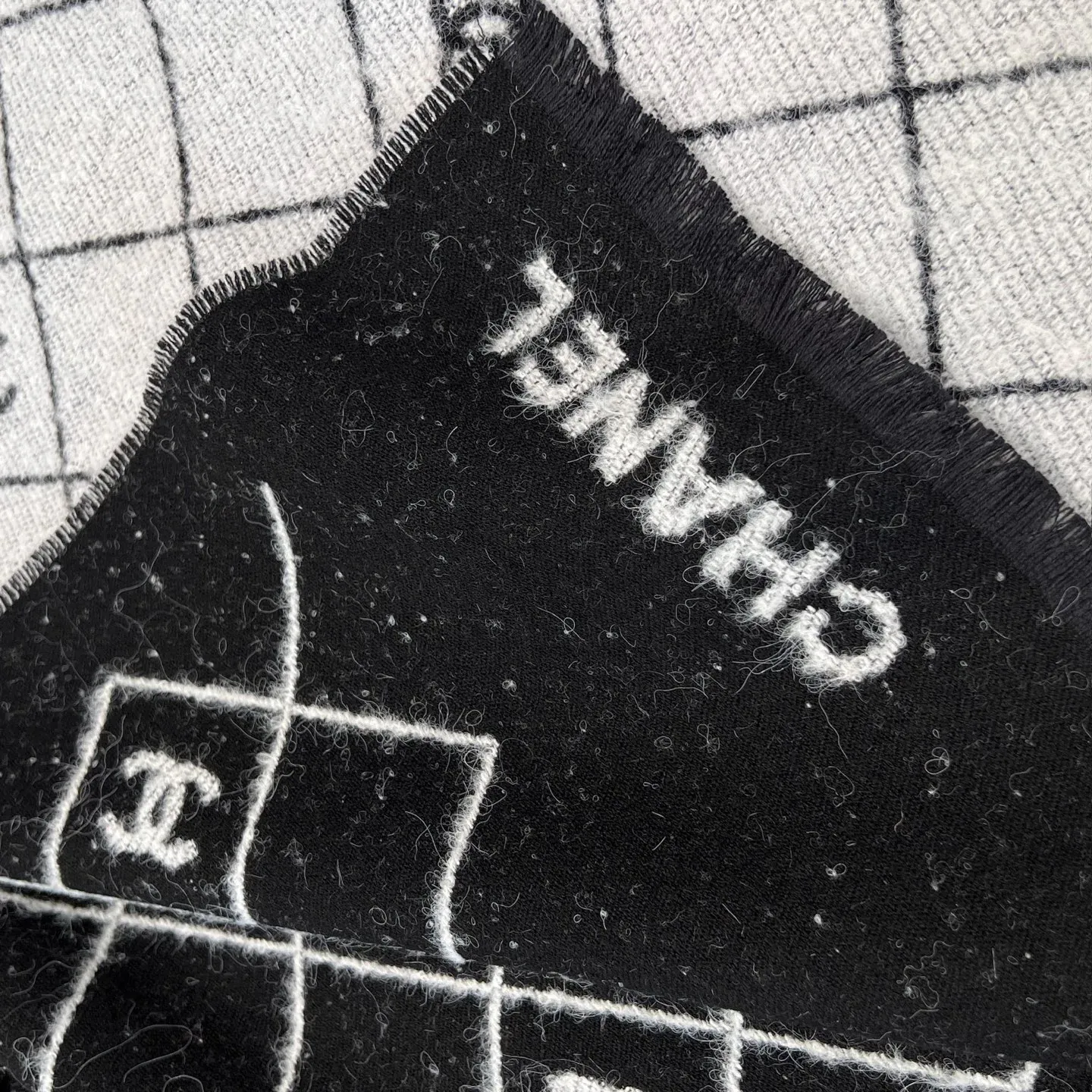 Палантин декоративно украшен фирменным логотипом CHANEL и имеет ручную отделку бахромой по краям. Благодаря двустороннему дизайну, его можно использовать с обеих сторон, создавая разные образы. Аксессуар легко вписывается в любой наряд и подходит для холодной погоды.