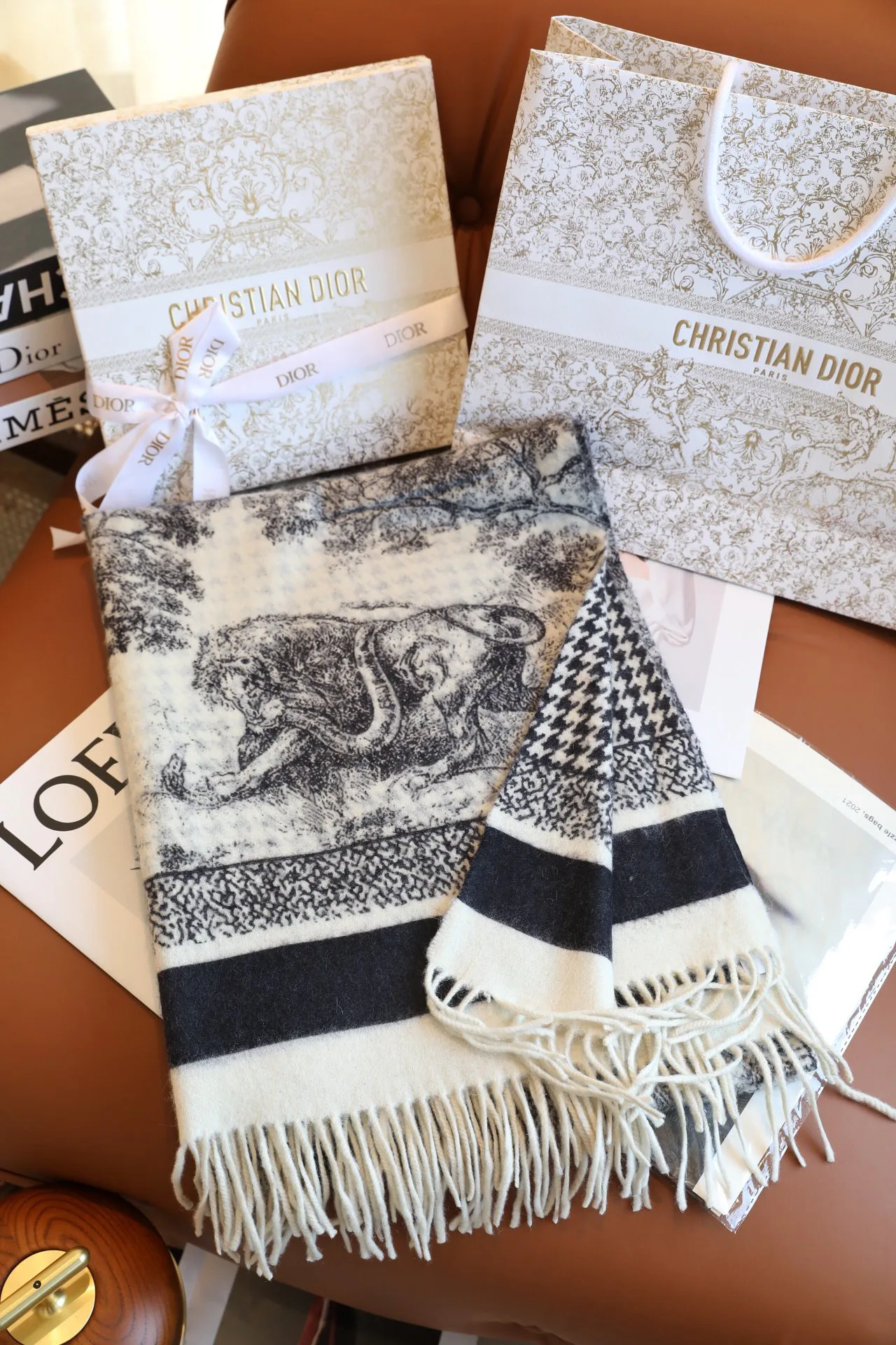 Шарфы CHRISTIAN DIOR — большой кашемировый шарф размером 200 × 65 см. Он украшен принтом джунгльных животных, который сочетается с узором гусиная лапка. Материал — кашемир, что обеспечивает тепло и комфорт при носке. Уход за изделием требует бережного обращения.