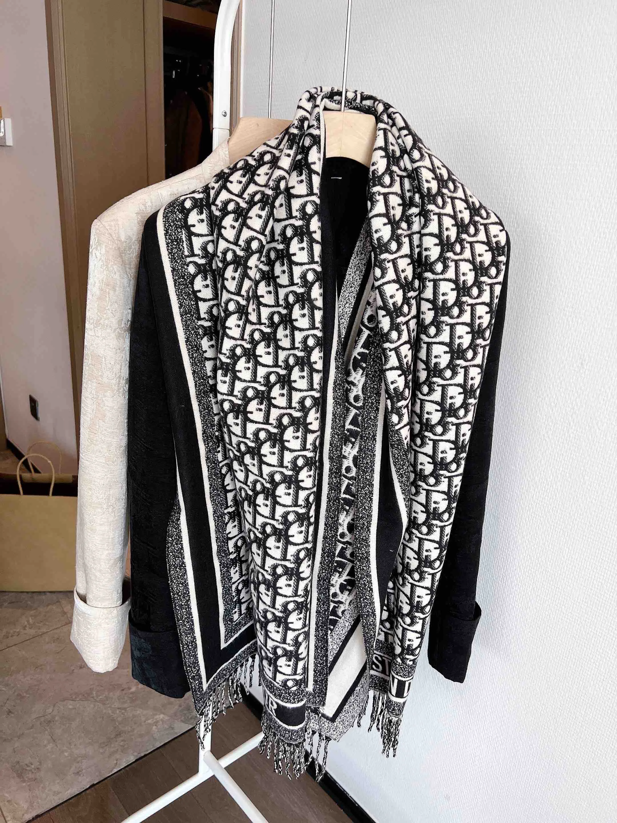 Размер шарфа составляет 180 см × 65 см, что позволяет комфортно оборачивать его вокруг шеи. Мягкая текстура ткани приятна на коже и обеспечивает комфорт при носке. Этот шарф — стильное дизайнерское решение, вдохновлённое эстетикой Dior, которое подчеркивает статус владельца.