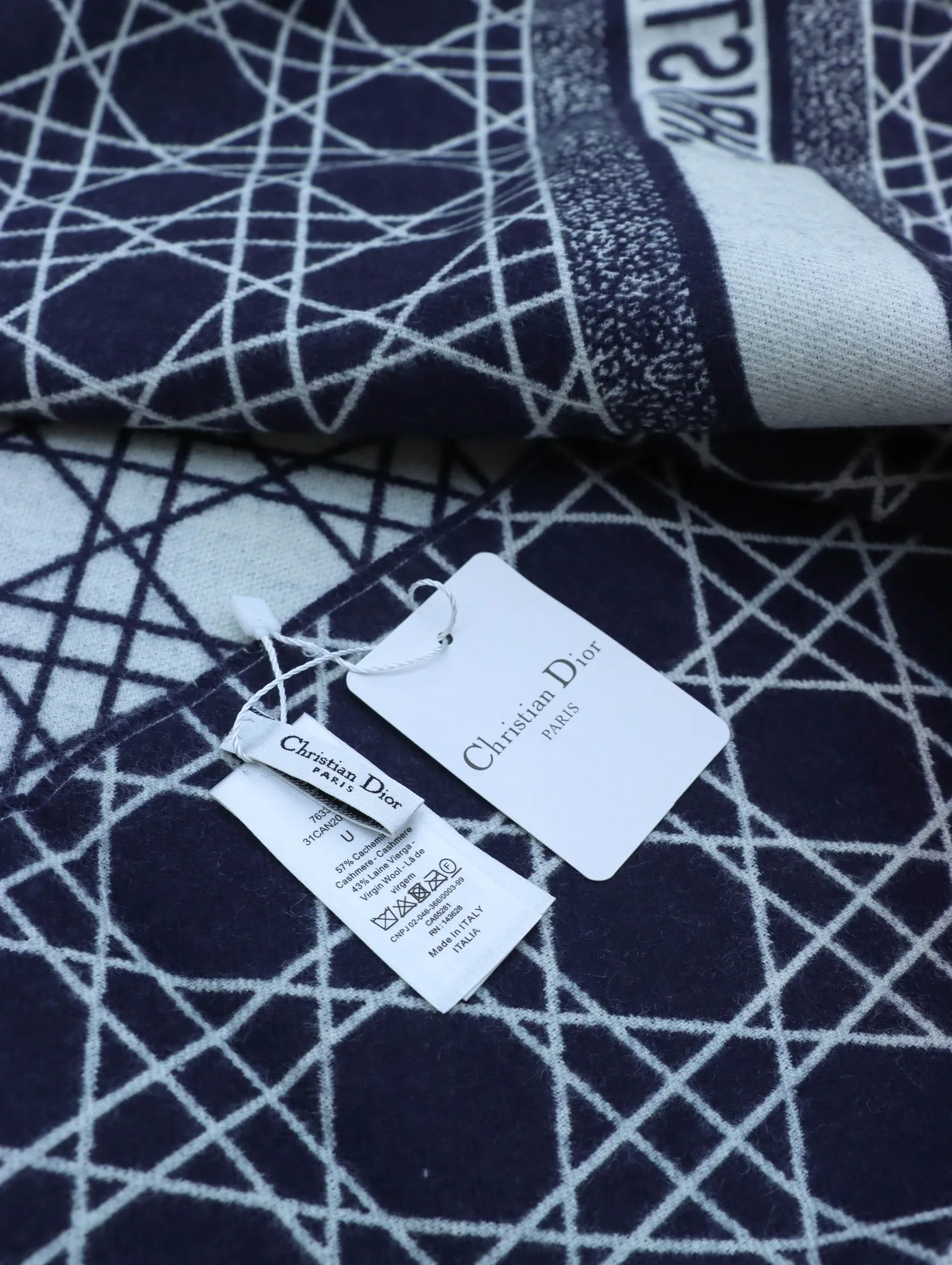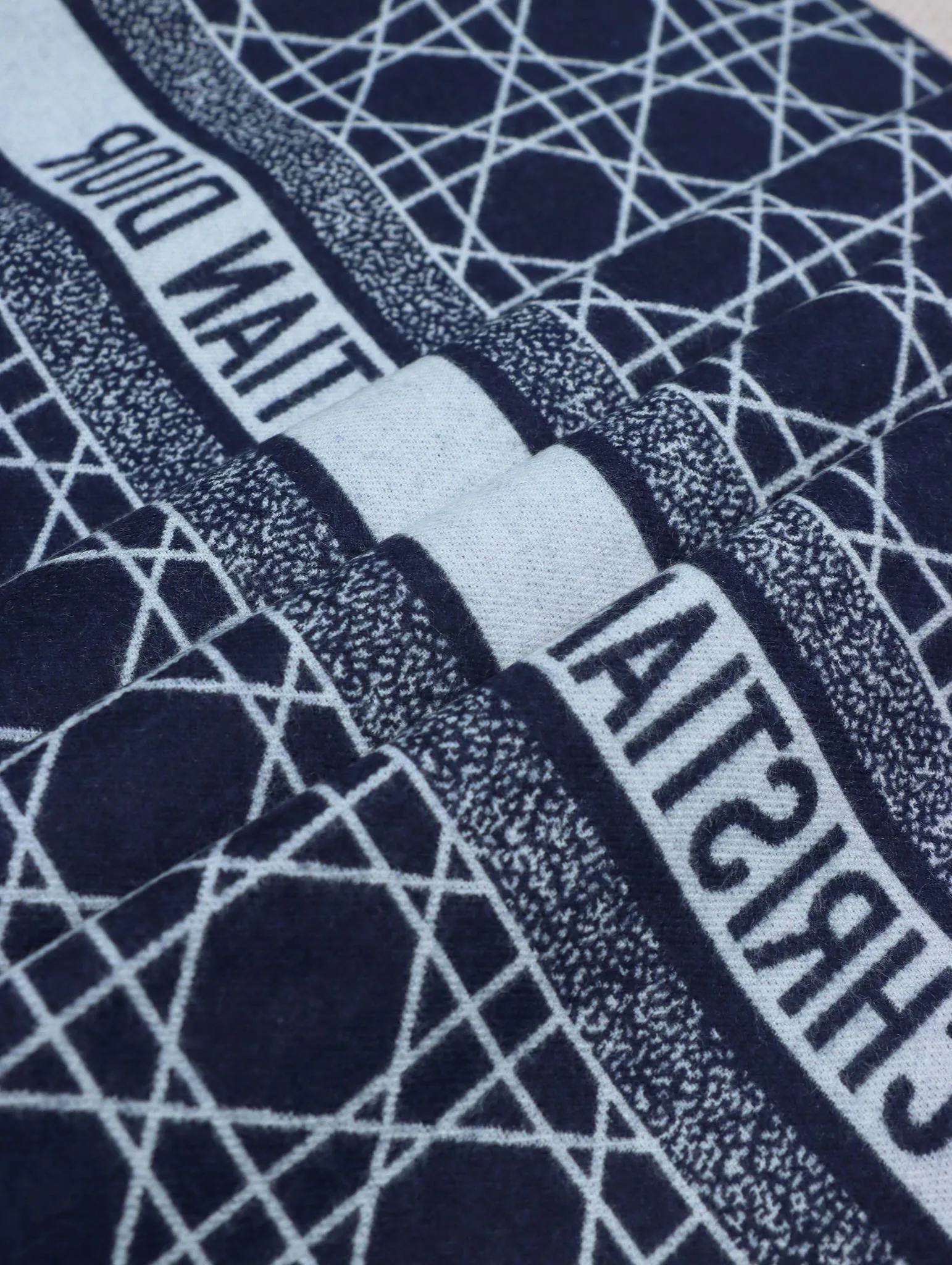 Шарф выполнен в двустороннем исполнении с темно-синим и кремово-белым цветами. Дизайн включает двустороннюю фактуру с эффектной бахромой по краям и контрастную жаккардовую ленту с надписью CHRISTIAN DIOR, подчеркивающую статус бренда. Размер шарфа составляет 220 x 45 см, что позволяет удобно завязать его вокруг шеи или накинуть на плечи.