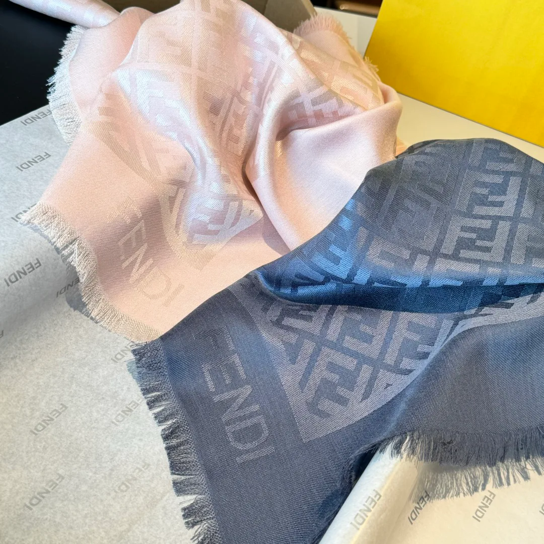 Размер шарфа 140 × 140 см. Мягкая ткань умеренной толщины удобна в носке и проста в уходе. Дизайн включает крупный квадрат с двойной буквой F, формируя узнаваемый мотив FF. Шарф универсален в повседневных и вечерних луках: его можно надеть на плечи поверх пальто, обернуть шею или использовать как накидку. Аксессуар актуален в раннюю осень, особенно с тёмными и нейтральными нарядами.