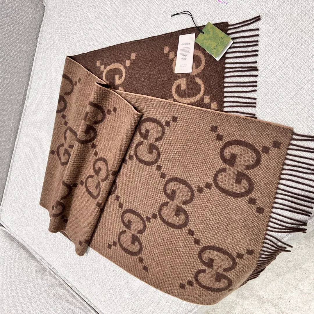 Шарф имеет жаккардовый узор с крупной монограммой G, каждая сторона имеет свой цветовой оттенок, позволяя менять образ. Натуральный материал обеспечивает мягкость и тепло, а плотный вес кашемира способствует исключительной тепловой способности. Рекомендуется ручная стирка холодной водой и бережная обработка; не отбеливать и избегать высоких температур при сушке.