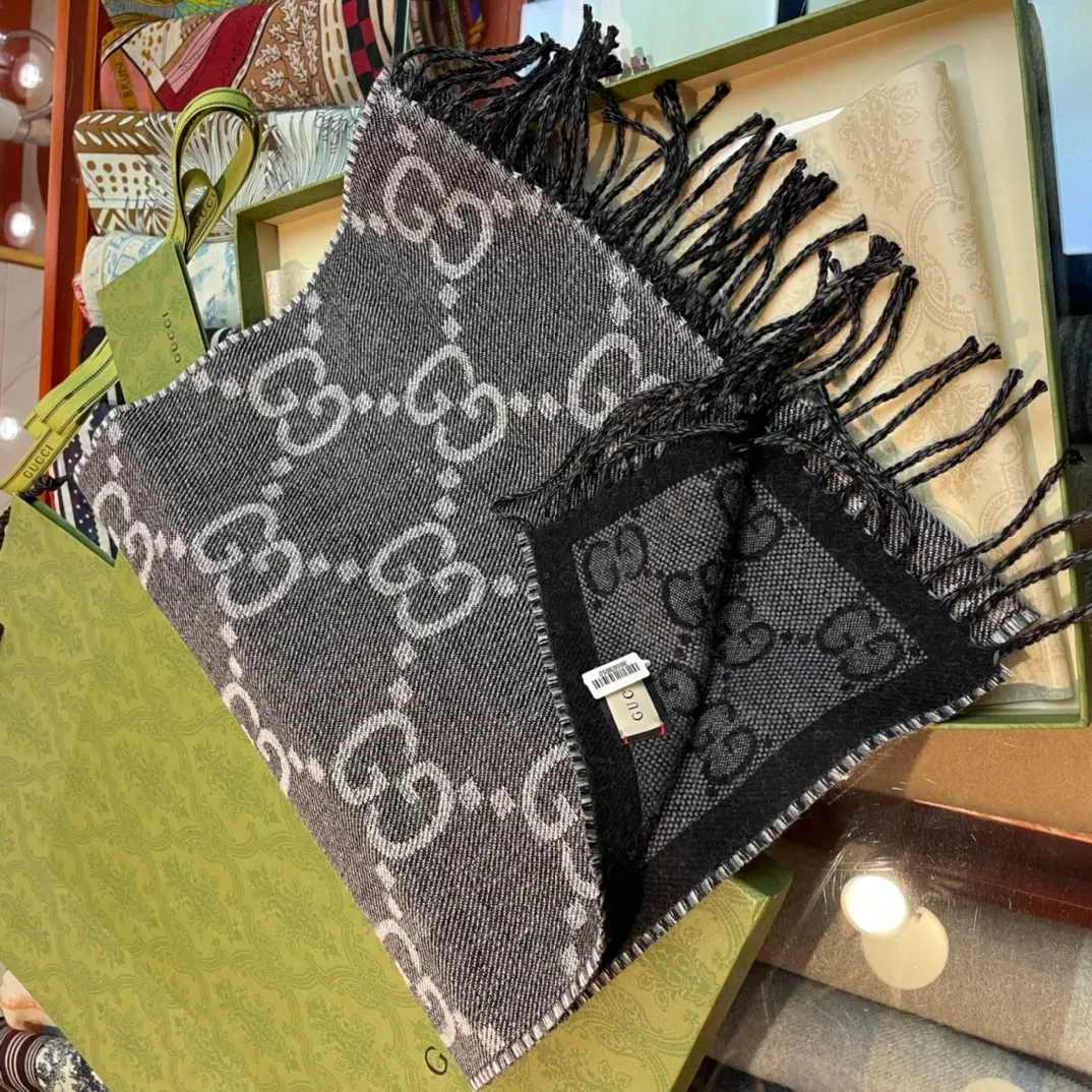 Шарф GUCCI — жаккардовый вязаный шарф с бахромой. В оттенках денимово-серого и черно-серого создаётся спокойный контраст, подчеркивающий узор. Текстура мягкая, не колется и приятно держится на шее. Узор выполнен в жаккардовой технике, бахрома дополняет стиль. Размер 35×180 см, шарф можно сочетать с различными образами. Он легко впишется в повседневные и деловые комплекты, добавляя сдержанный акцент.