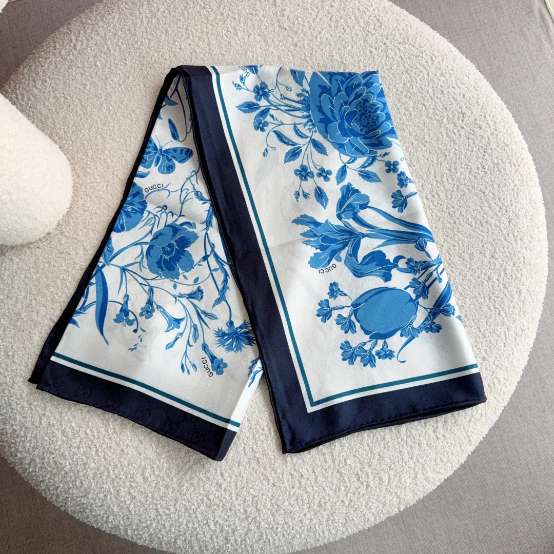 Шарфы GUCCI — размер 90×90 см, изготовлены из шелкового жаккарда и украшены двусторонним принтом, край оформлен ручной подгибкой. Материал — шелковый жаккард, ткань известна своей гладкостью и благородным блеском. Принт наносится с обеих сторон. Край изделия выполнен вручную. Такое сочетание фактуры и двустороннего принта демонстрирует аккуратность отделки.