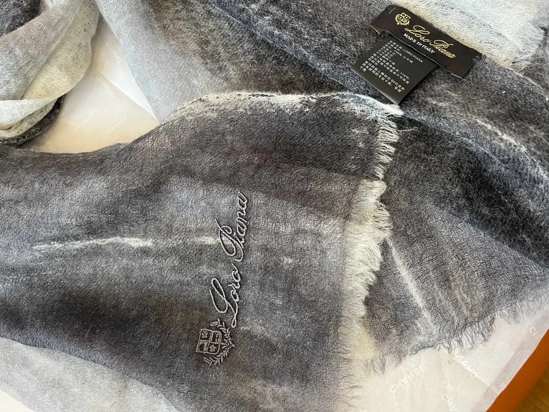 Размер шарфа — 90 см × 200 см, что удобно для стильной носки и комфортного оборачивания. Подходит для любых сезонов и различных образов. Градиентные переходы создают эффект плавного цветового сдвига, а вышитый логотип подчеркивает уникальность изделия.