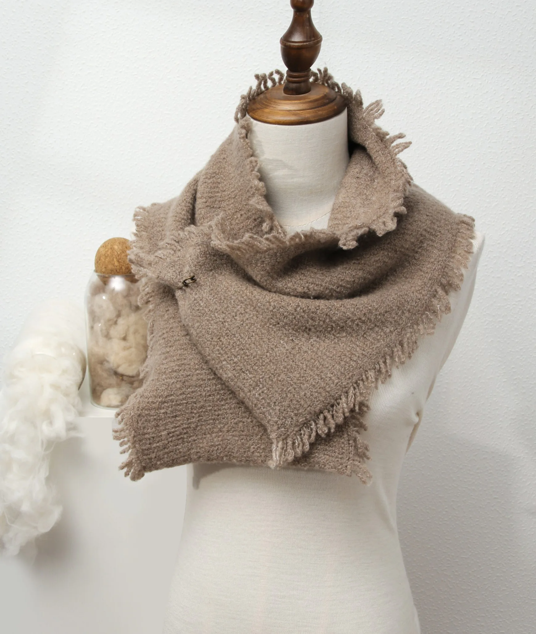 Особенностью этого кашемирового изделия является использование эластичных волокон, что придаёт ему дополнительную объёмность и пышность, выделяя его среди большинства кашемировых аксессуаров на рынке благодаря уникальной текстуре и изысканному стилю.