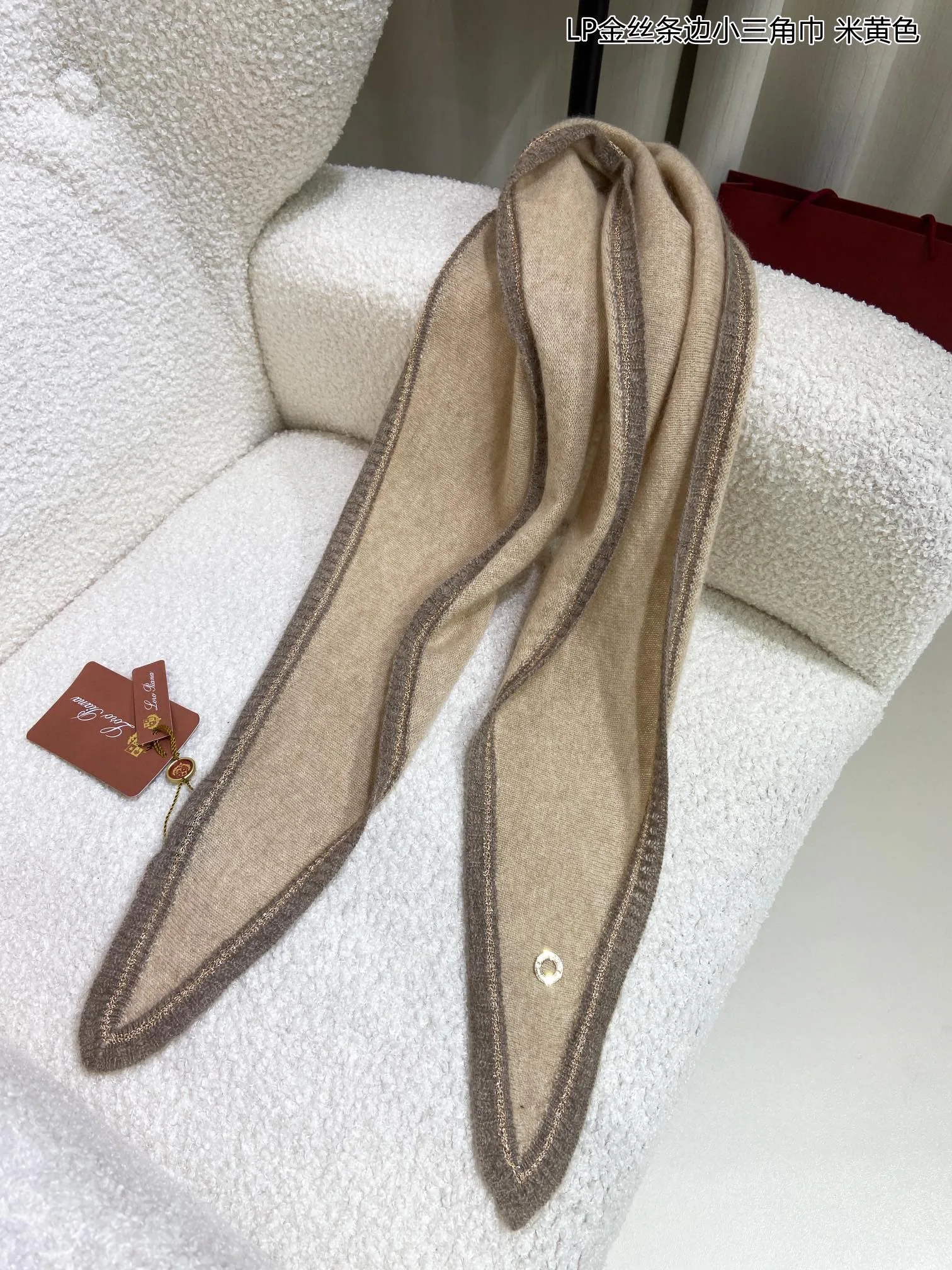 Шарф с изысканной золотой нитяной каймой вдоль края выделяется своим дизайном и подчеркивает благородство образа. Несмотря на лаконичный размер, он может украшать шею и завершать различные луки. Его удобно обернуть вокруг шеи или дополнить верхнюю одежду, пальто и куртки.