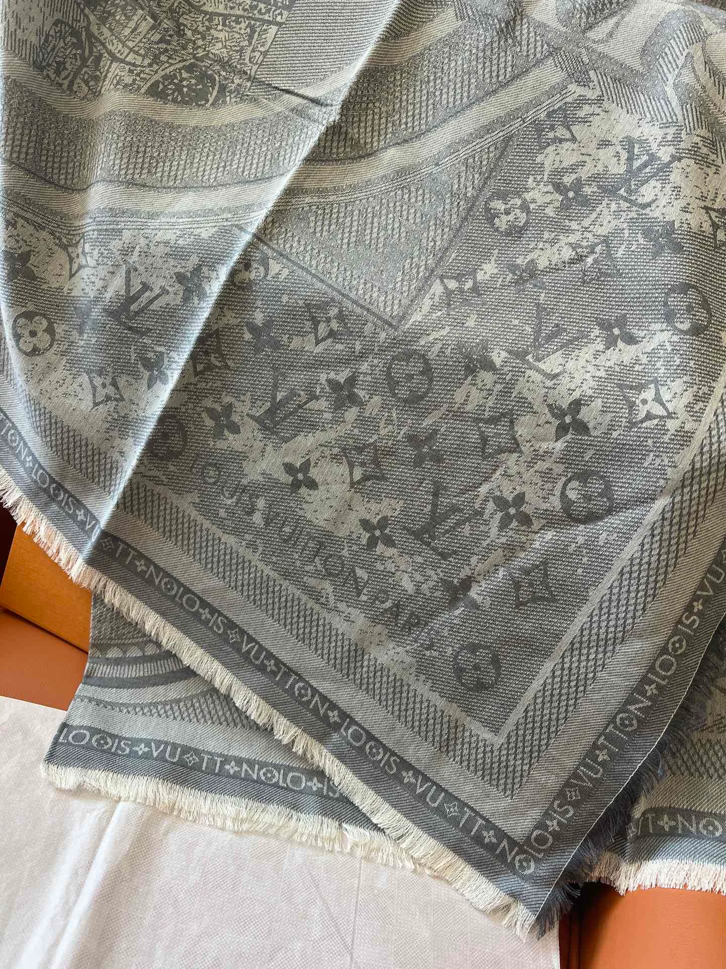 Узор шарфа выполнен в ретро-жаккардовом стиле, который напоминает старинные рекламные плакаты, сохраняя современную эстетику. Благодаря универсальным размерам, шарф можно носить как классический платок, накидку через плечи или объемный драпированный аксессуар. Этот элемент гардероба освежает любой образ и подходит для разных сезонов.