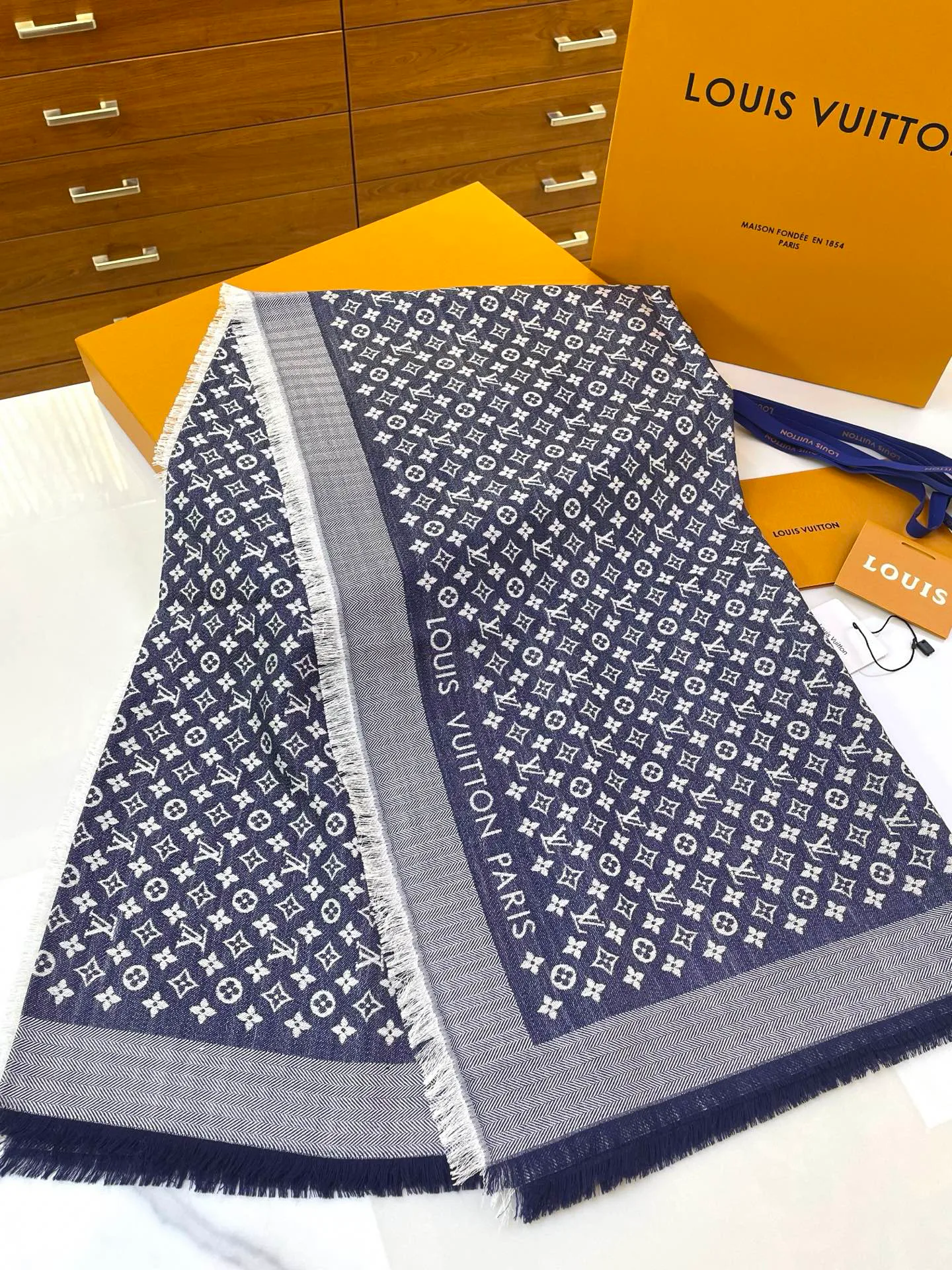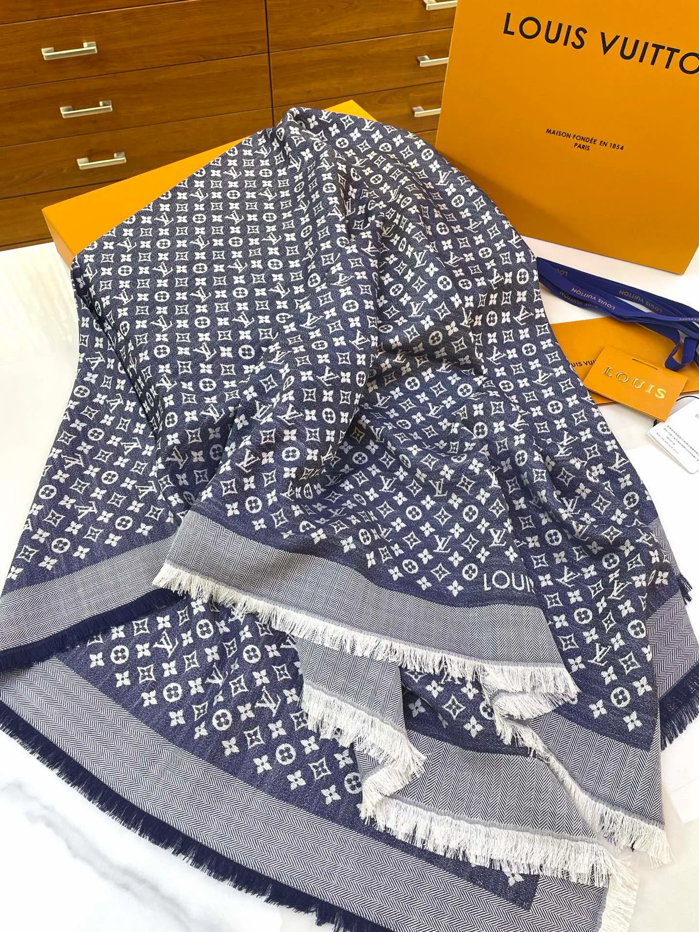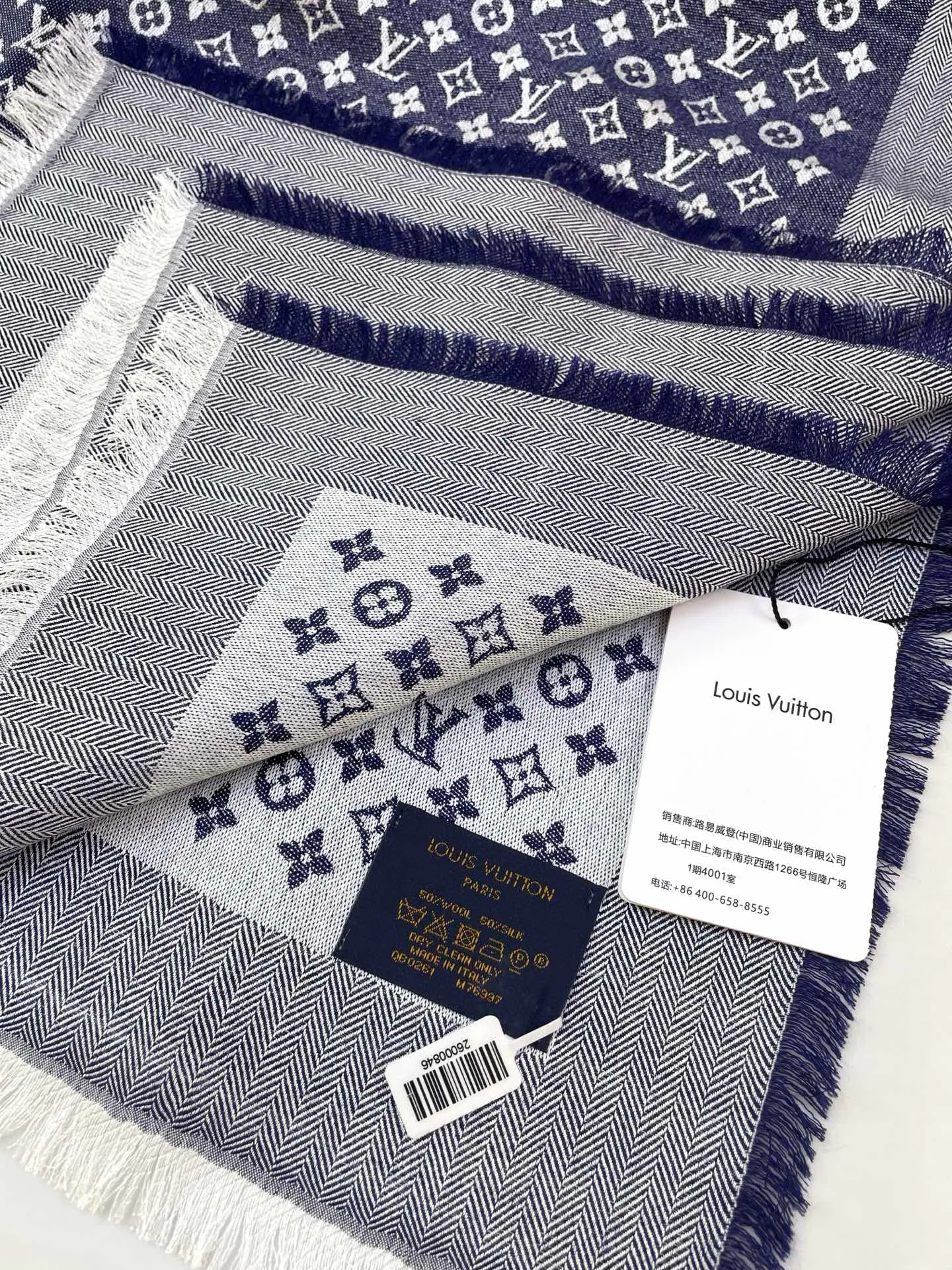 Дизайн выполнен в классическом монограммном узоре LV с лаконичной надписью Louis Vuitton Paris. Шаль имеет размер 125 × 125 см, что делает её универсальной для различных способов носки — вокруг плеч или шеи.