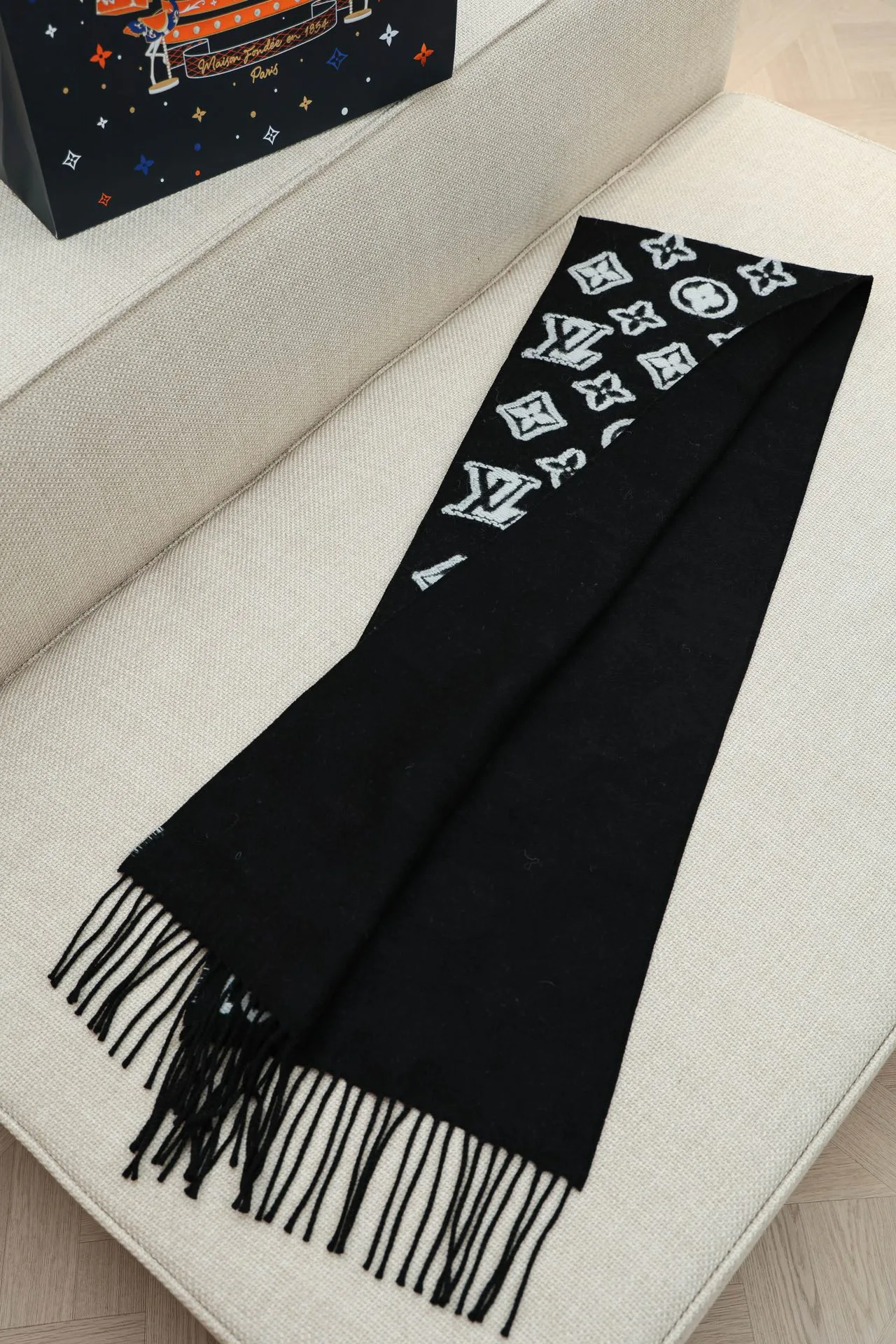 Дизайн включает монограммный узор, характерный для бренда, и контрастные отделочные детали из шерстяного меха, формирующие 3D-эффект. Технология cut-work придаёт уникальную фактуру по обе стороны шарфа, обеспечивая разнообразие в стилизации. На нижнем ярлыке размещён QR-код для проверки данных изделия, рекомендуется профессиональная сухая чистка.