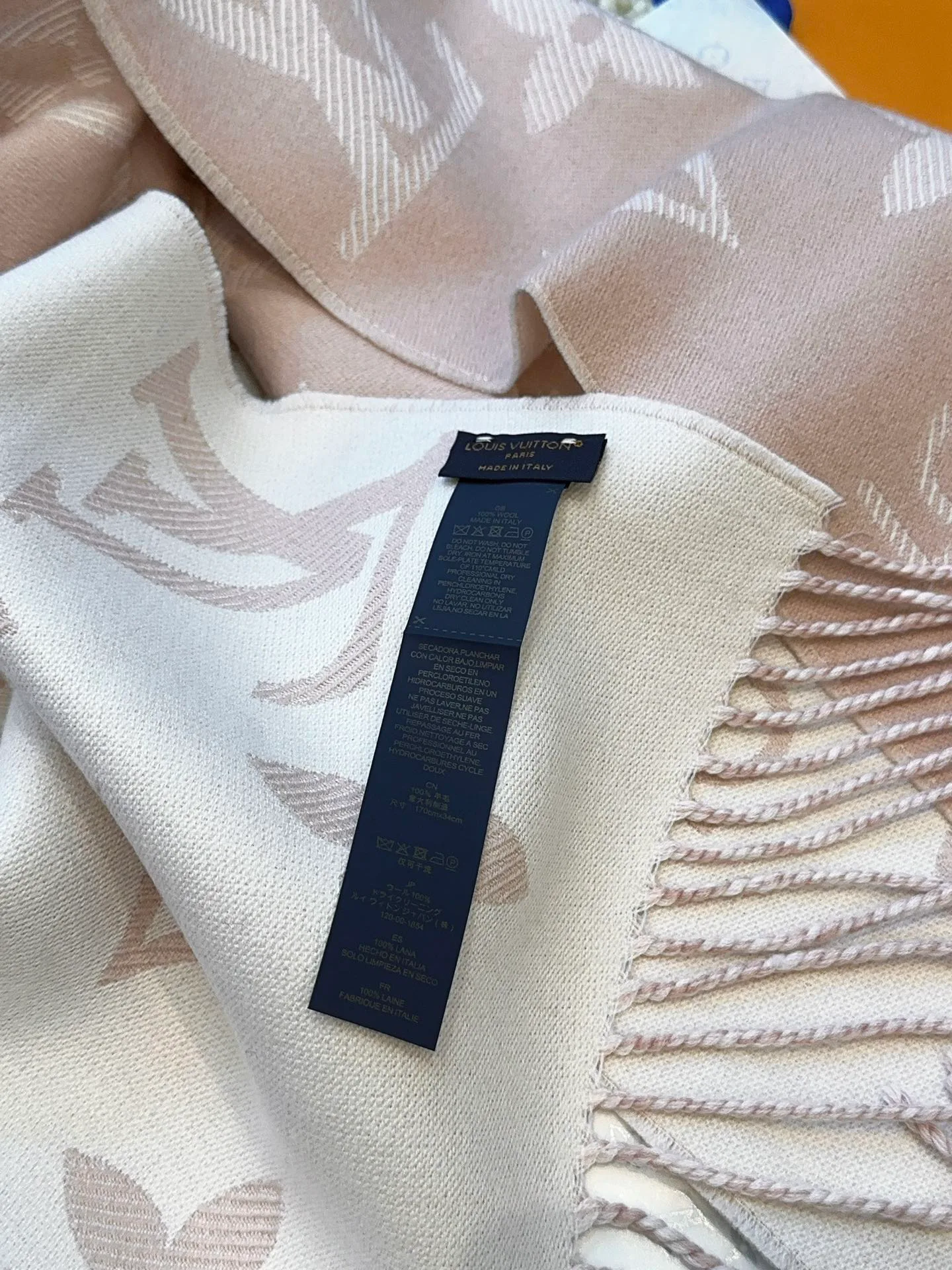 Основной акцент в дизайне сделан на крупный Monogram-узор и логотип LOUIS VUITTON, которые подчеркивают высокую принадлежность к бренду и его безукоризненное качество. В качестве finishing-touch к шали добавлены мягкие и элегантные кисточки по краям, придающие изделию легкость и изящество.