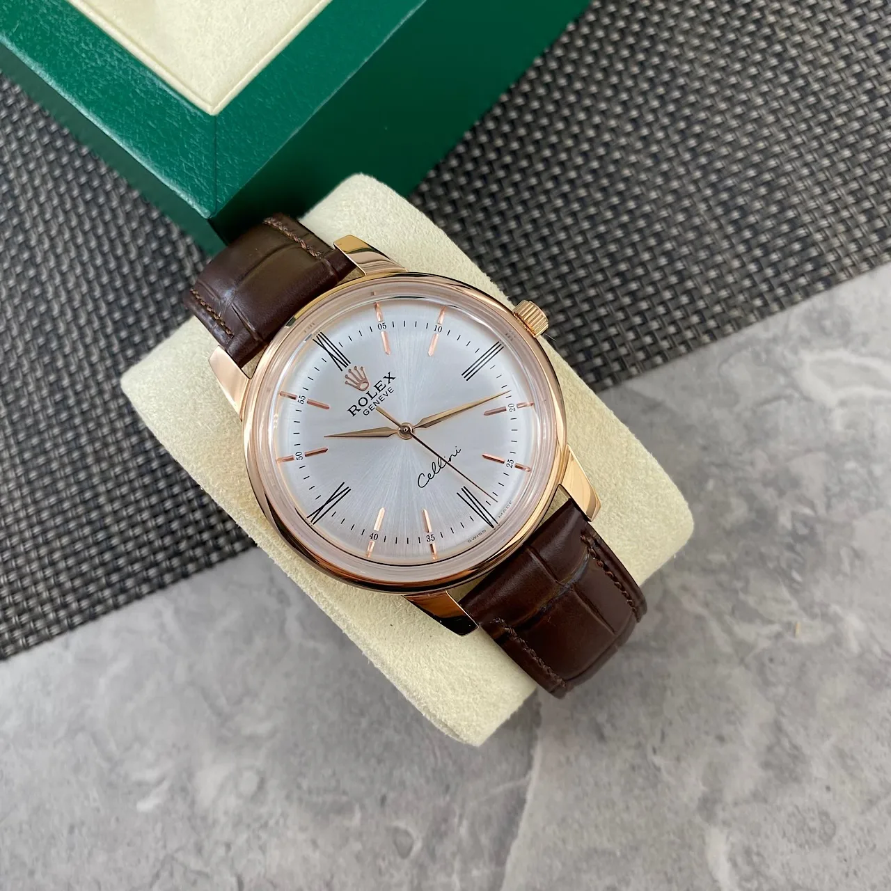 Классические часы мужские ROLEX — серебристый циферблат и черный кожаный ремешок. Диаметр корпуса 39 мм, часы оснащены автоматическим механизмом. Сапфировое стекло устойчиво к износу, корпус и браслет имеют аккуратную отделку, задняя крышка герметична и внешний вид близок к оригиналу. Эта модель была выпущена в 2014 году и сохраняет узнаваемый классический стиль.
