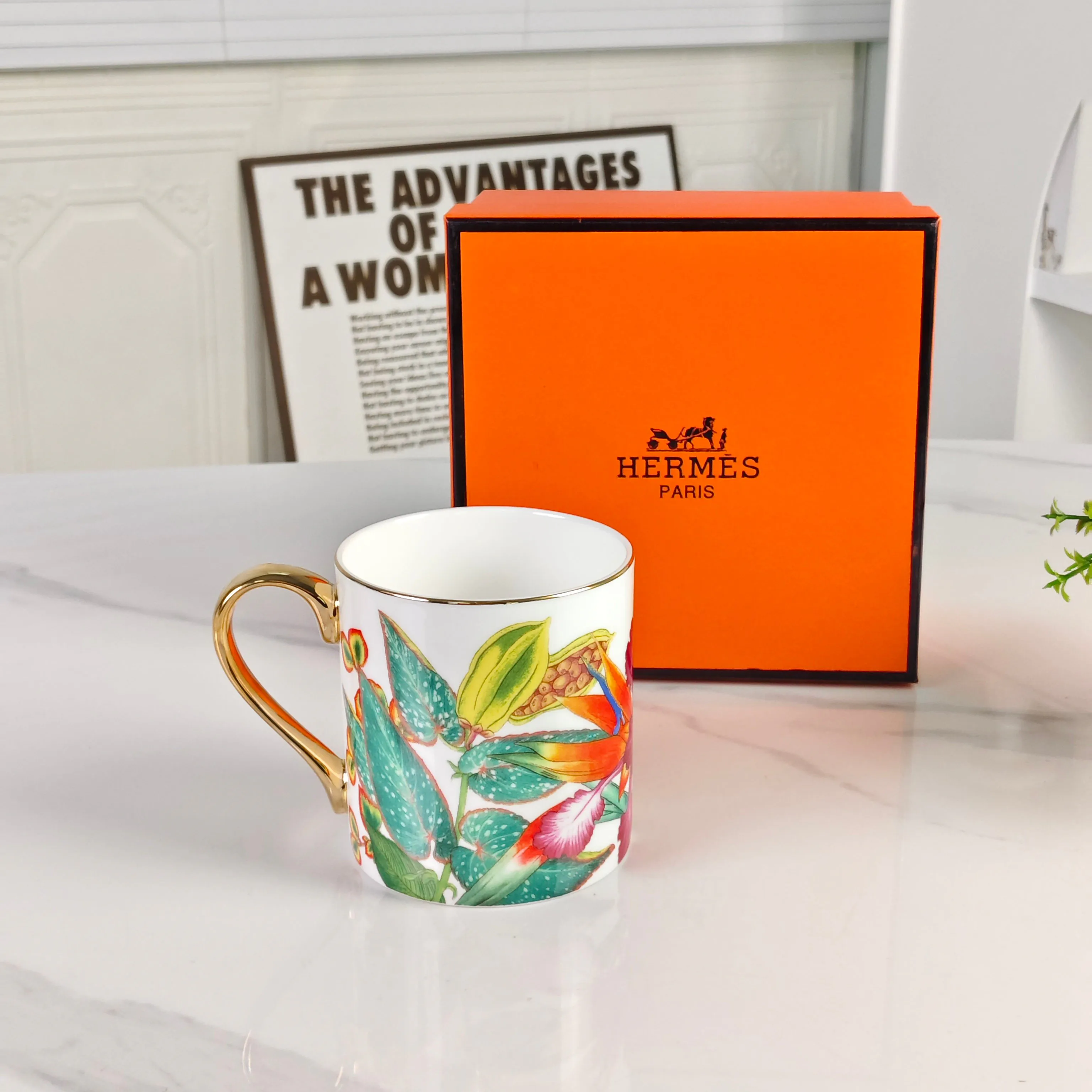 Посуда HERMES — это керамическая кружка из коллекции «Тропический лес». Изделие имеет классическую цилиндрическую форму диаметром 8.7 см и высотой 9.2 см. Его полезный объём составляет 400 миллилитров. Кружка поставляется в фирменной подарочной коробке размером 17 на 10.5 сантиметров.