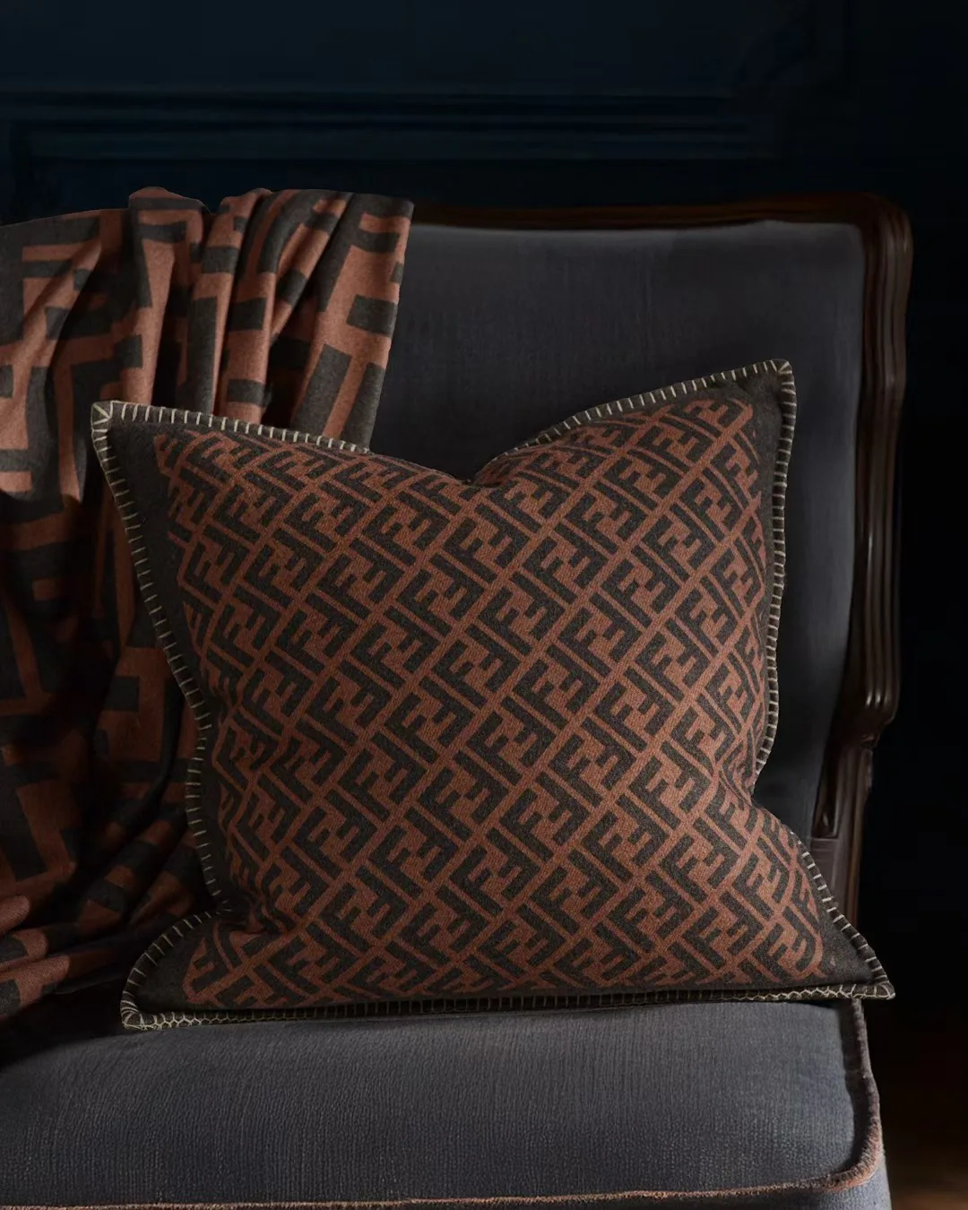 Текстиль FENDI — шерстяной твид с принтом и прямыми краями. Размеры: 145×145 см, 145×180 см и 145×200 см. Возможна настройка размеров по индивидуальному заказу. Можно дополнить подушками той же серии размером 45×45 см и 50×50 см.