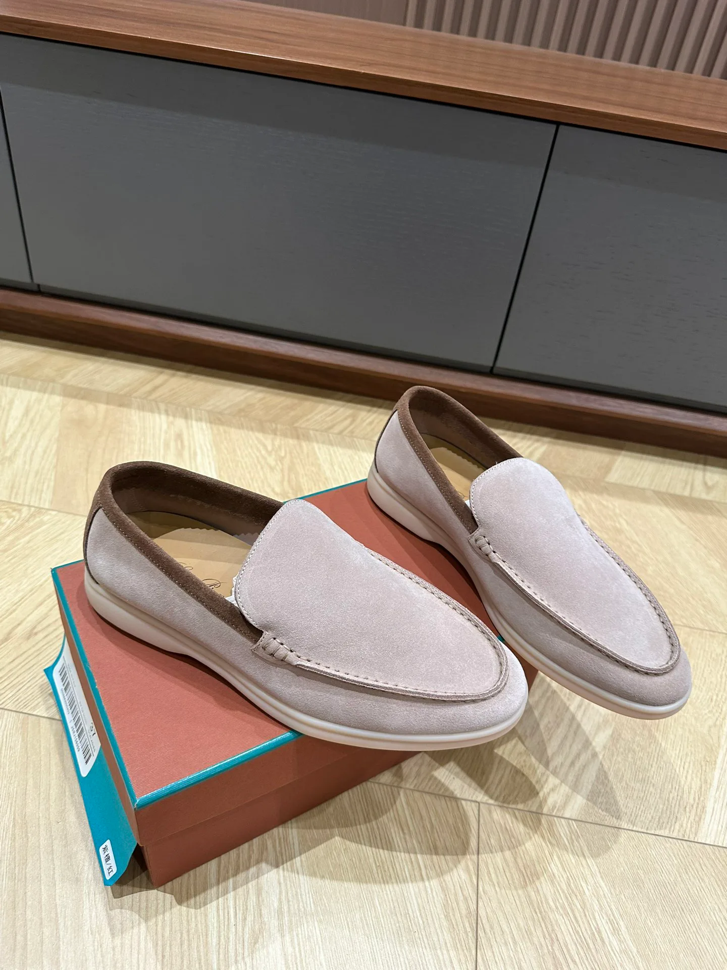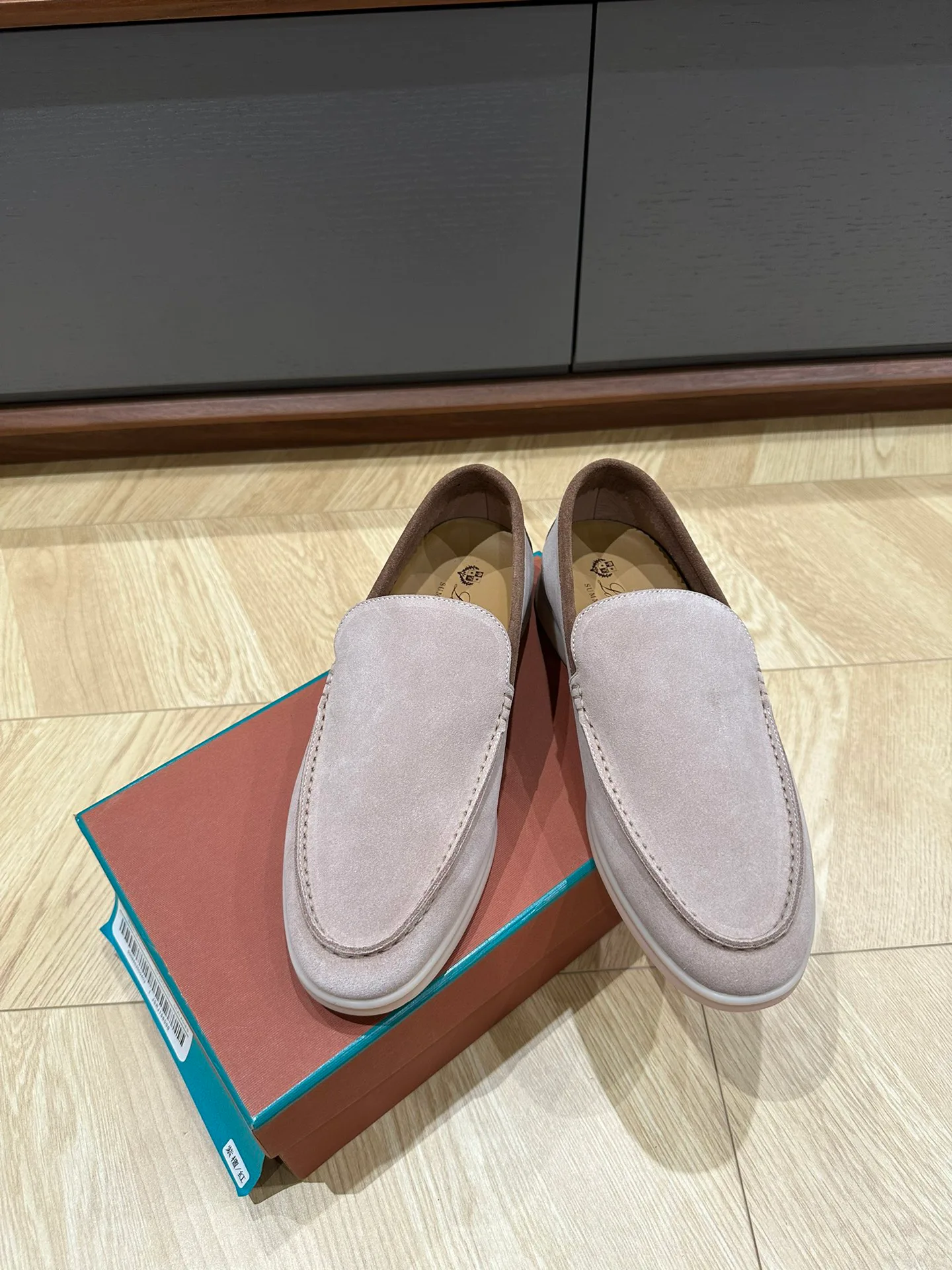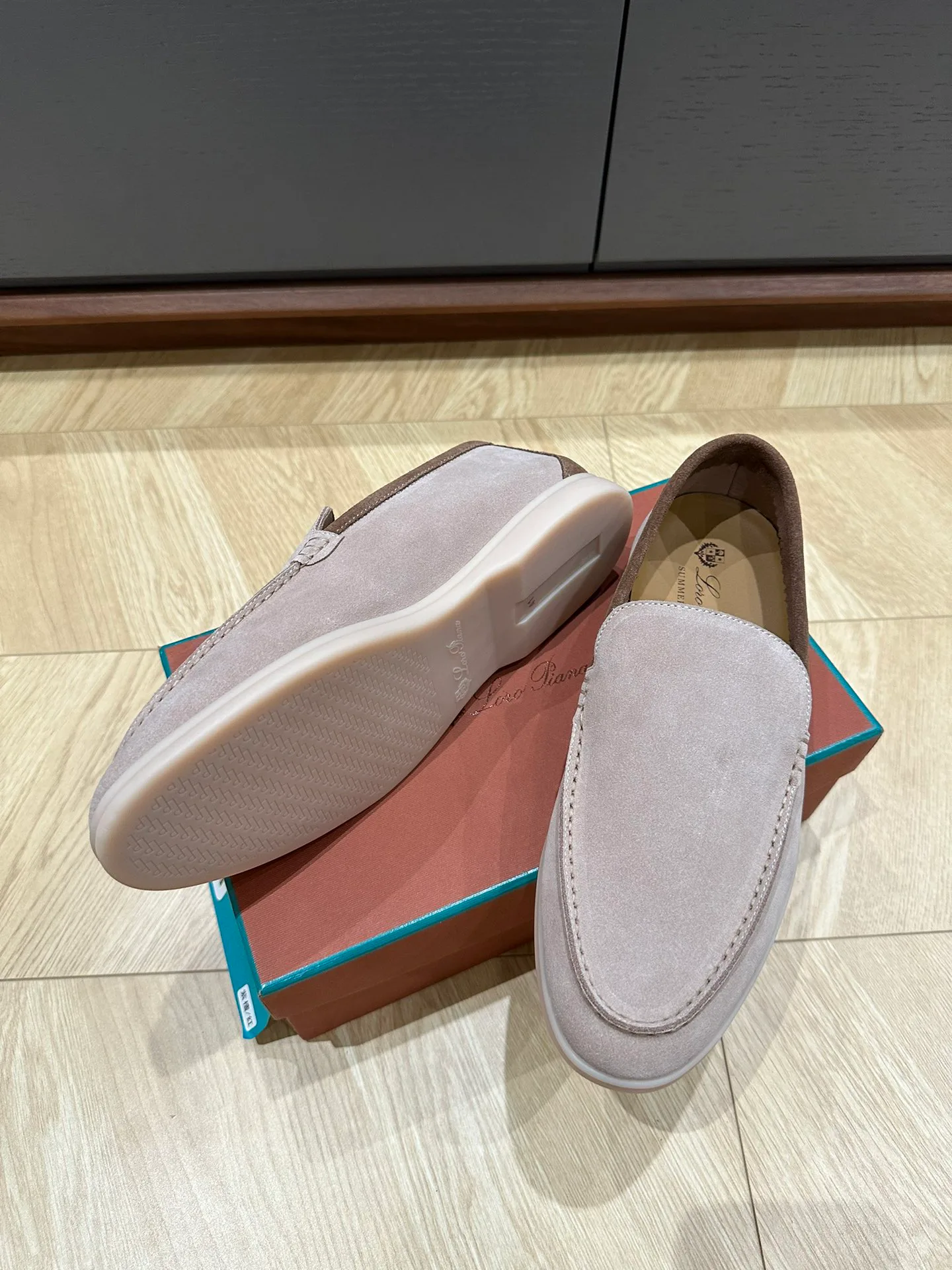 Изготовление этих легких и удобных лоферов включает в себя трудоемкий ручной процесс, что гарантирует высокое качество и долговечность. Подошва обуви имеет противоскользящее покрытие, оформленное в виде повторяющегося рельефного узора с аббревиатурой LORO PIANA, что придает им нотки сдержанной роскоши.