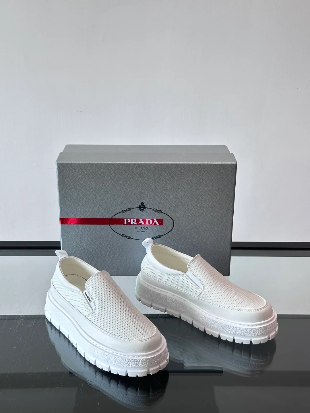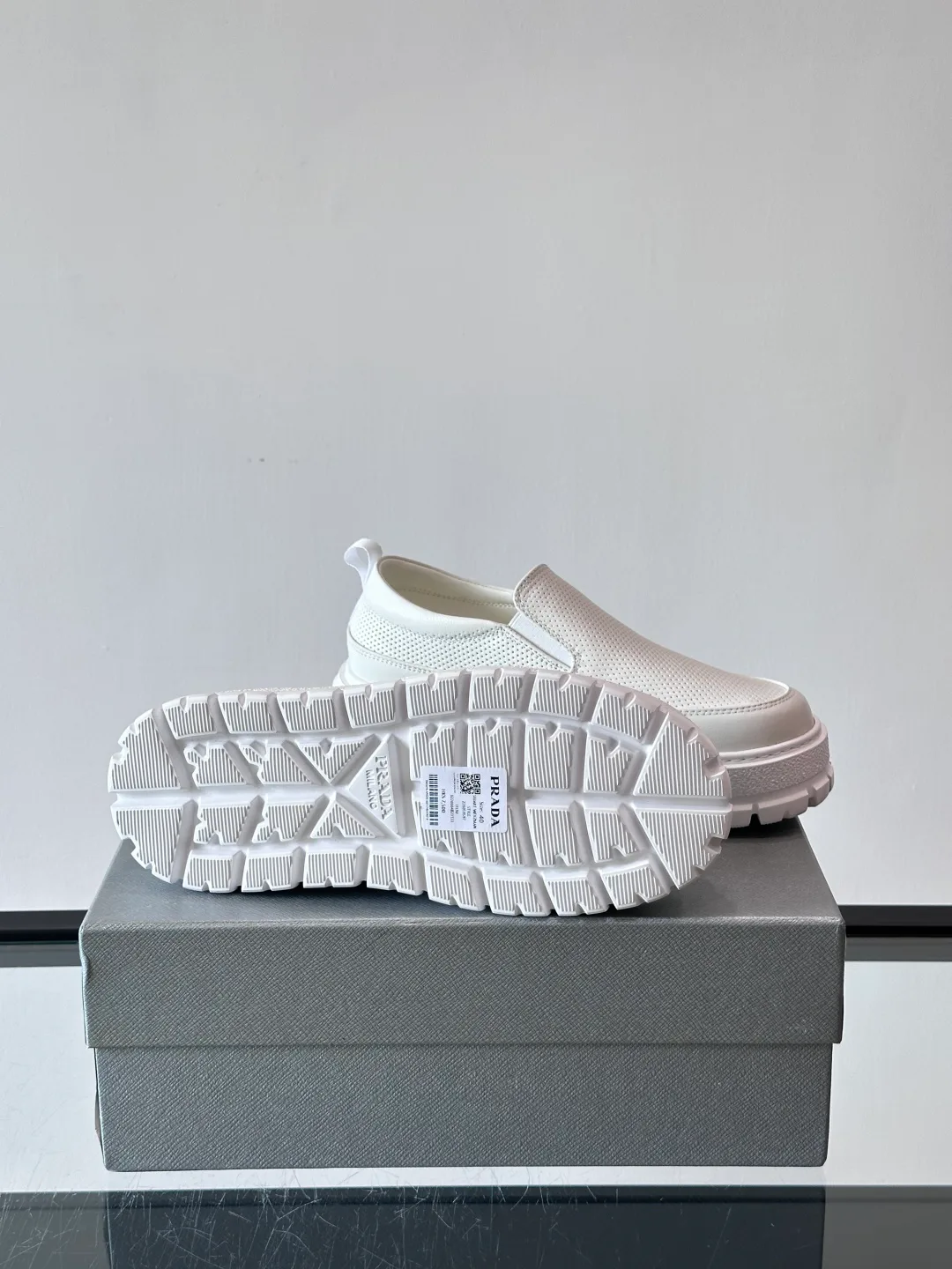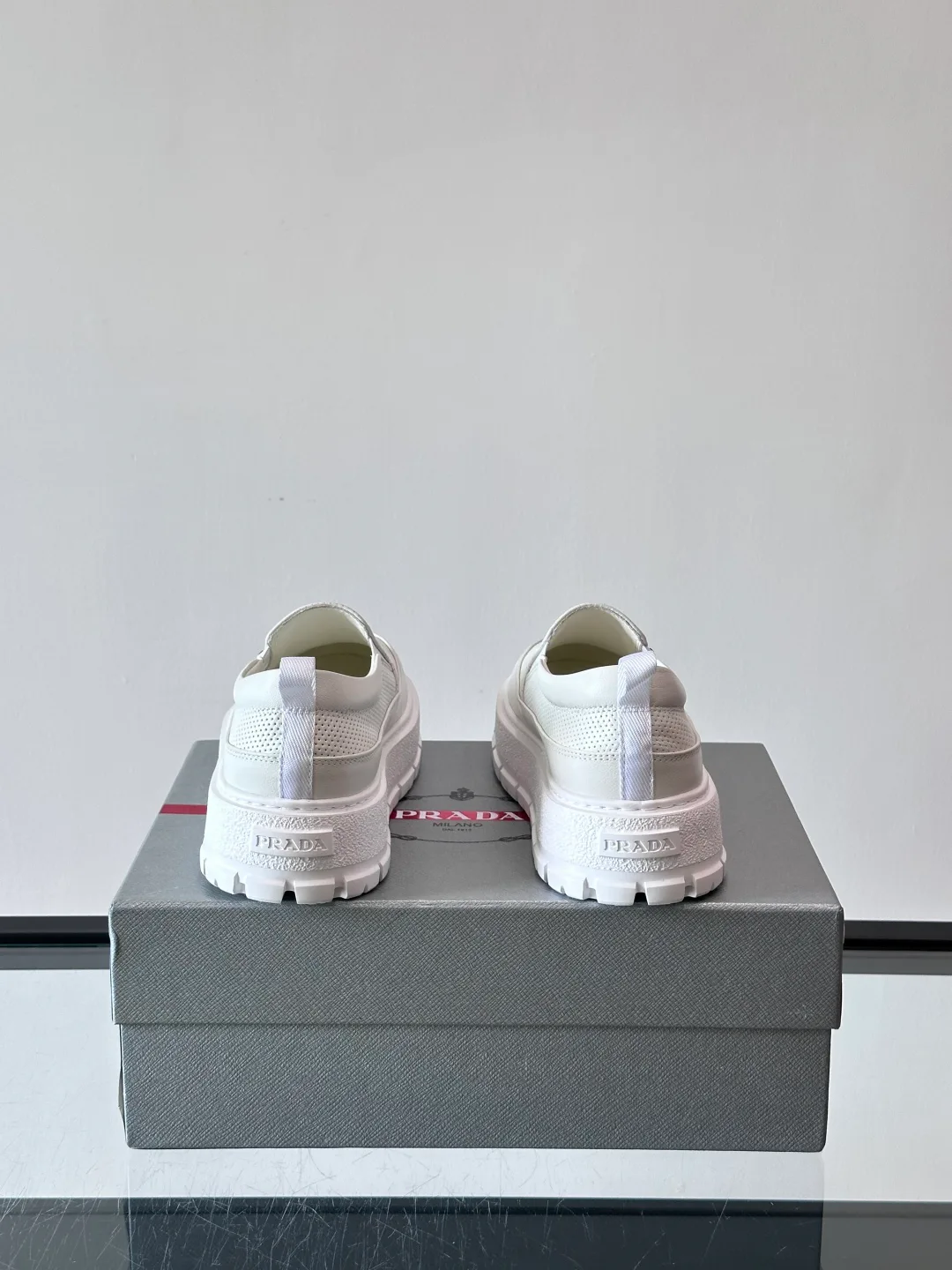 Обувь имеет поперечный кожаный ремешок с металлическим логотипом PRADA, добавляющим узнаваемый акцент. Рельефная резиновая подошва высотой 3 см обеспечивает хорошее сцепление и устойчивость. Внутри расположена дышащая подкладка и кожаная стелька с логотипом, повышающие комфорт.