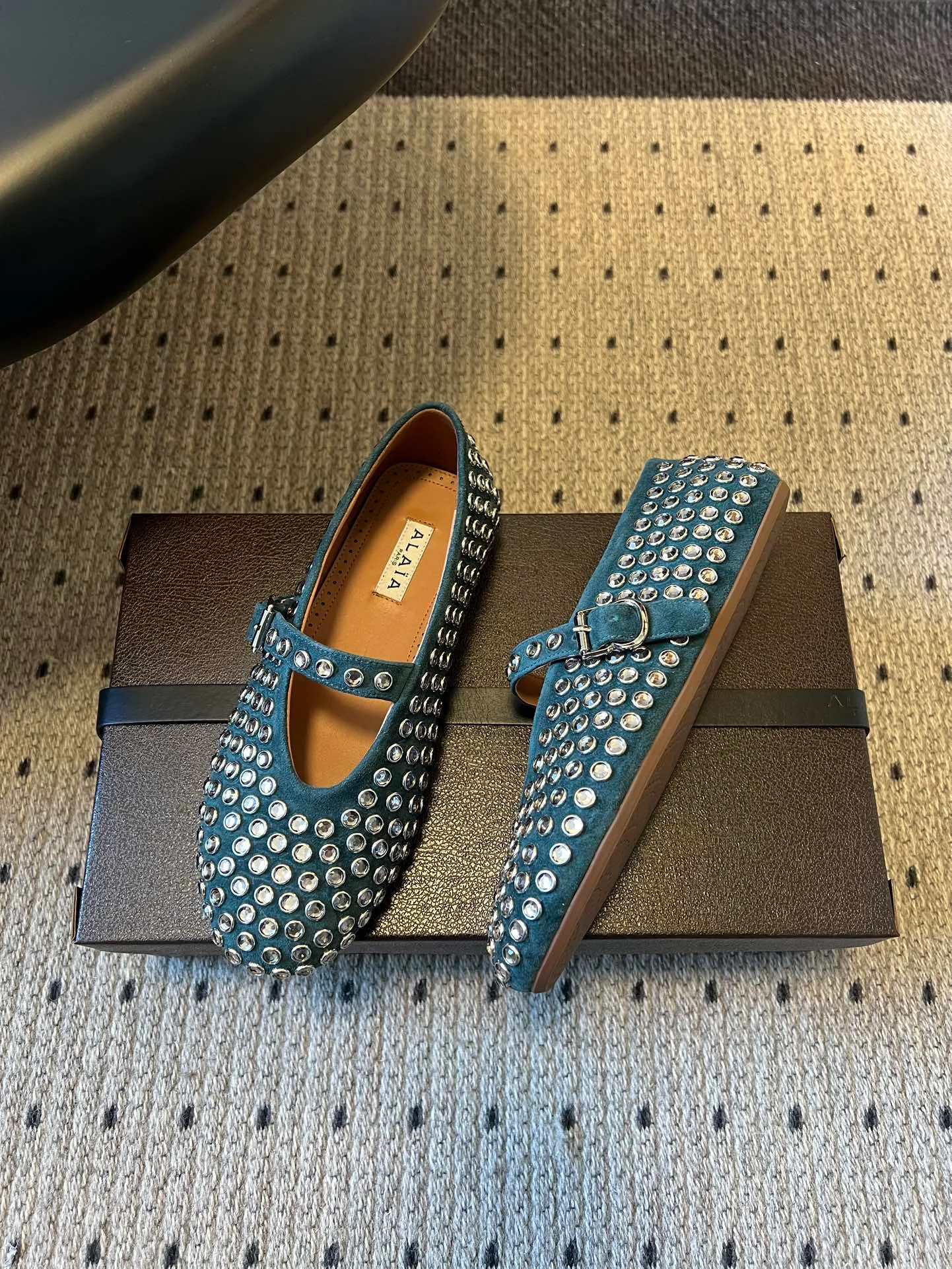 Балетки женские ALAIA — эксклюзивная модель с перекрестной лентой и кристаллизированной поверхностью, созданная для выразительного образа и комфорта. Верх выполнен из замши по заказу, с декоративной пряжкой, украшенной кристаллами. Подкладка — овечья кожа. Подошва — резиновая, нескользящая, подъём 2 см. Размеры: 35–39; 40-й размер изготавливается по индивидуальному заказу и возврату не подлежит.