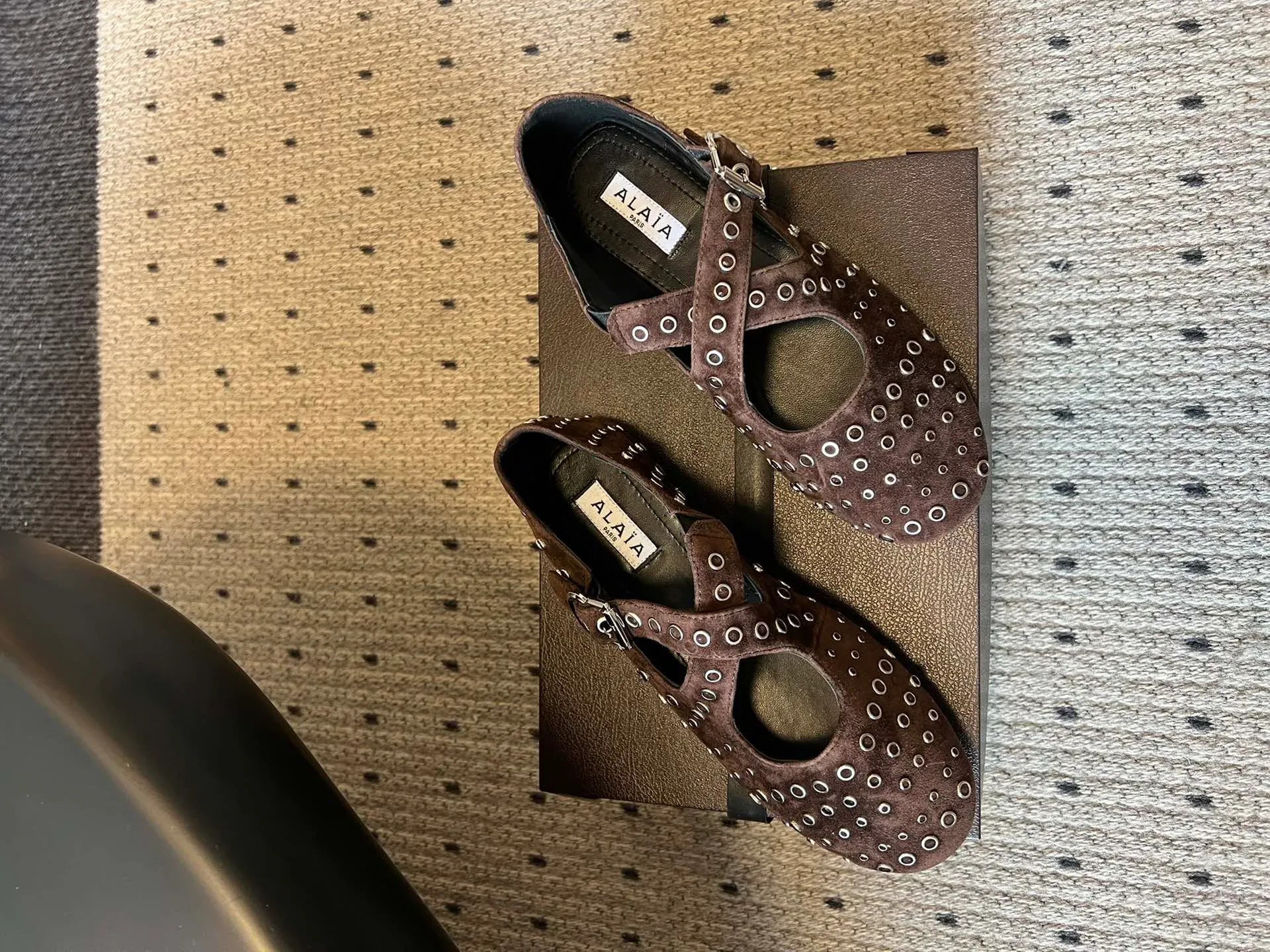 Балетки женские ALAIA — модель 26ss с круглыми перфорированными отверстиями на верхней части и перекрещивающимися ремешками в стиле Мэри Джейн. Узор из перфорации служит декоративным элементом и обеспечивает воздухопроницаемость, подчеркивая узнаваемый почерк бренда. Обувь сочетает французскую ретро-эстетику с современной лаконичностью, подходя для повседневных и нарядных образов. Верх выполнен из замши, внутренняя отделка — из кожи ягненка, а подошва добавляет около 2 сантиметров к высоте.