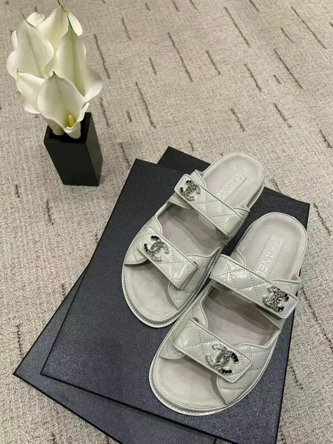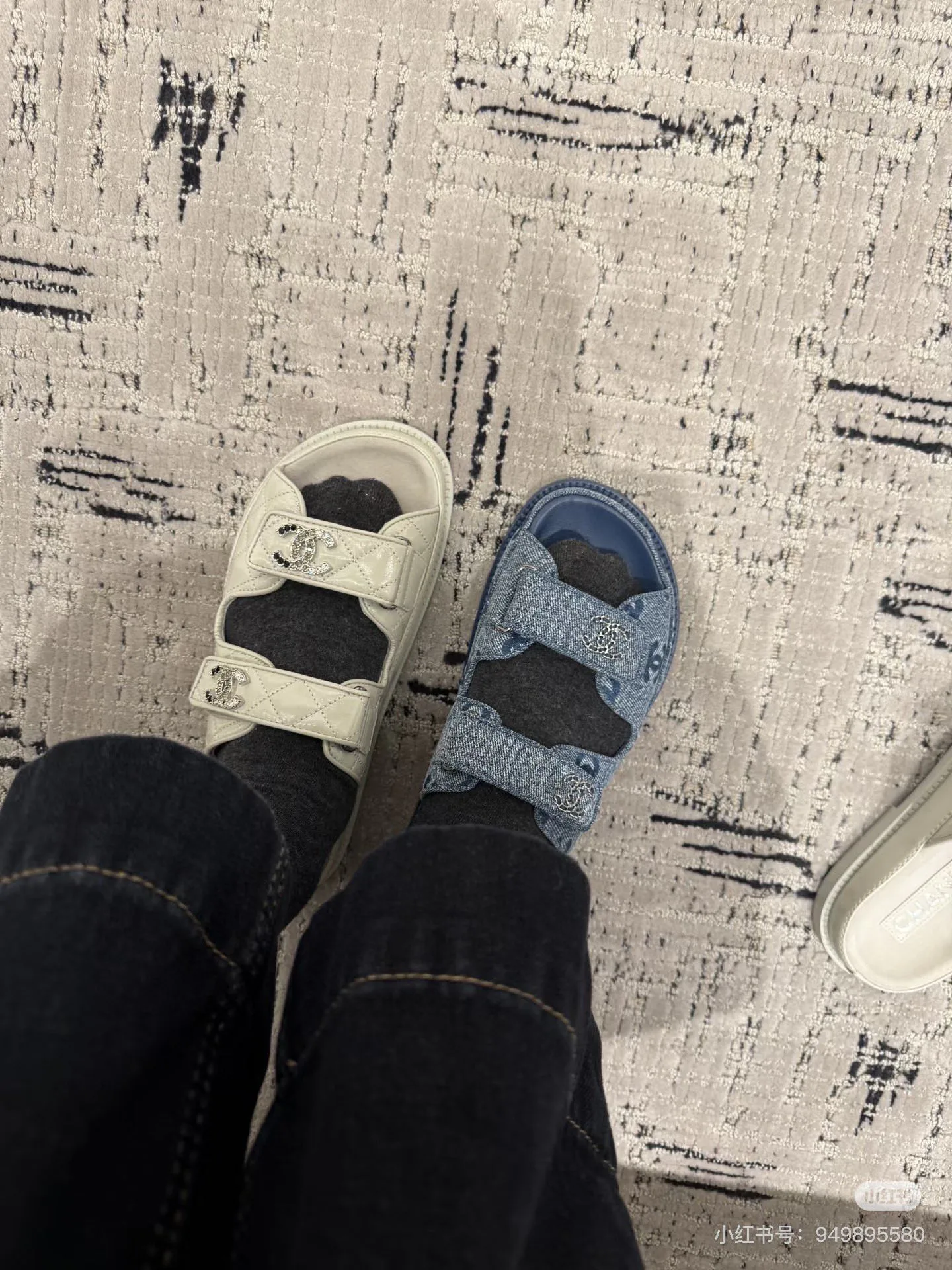 Вторая модель более повседневная — из синего денима с графическим принтом, на котором также изображён логотип CHANEL. Такой дизайн делает сандалии универсальными для casual-образов. Застёжки на липучках упрощают одевание.