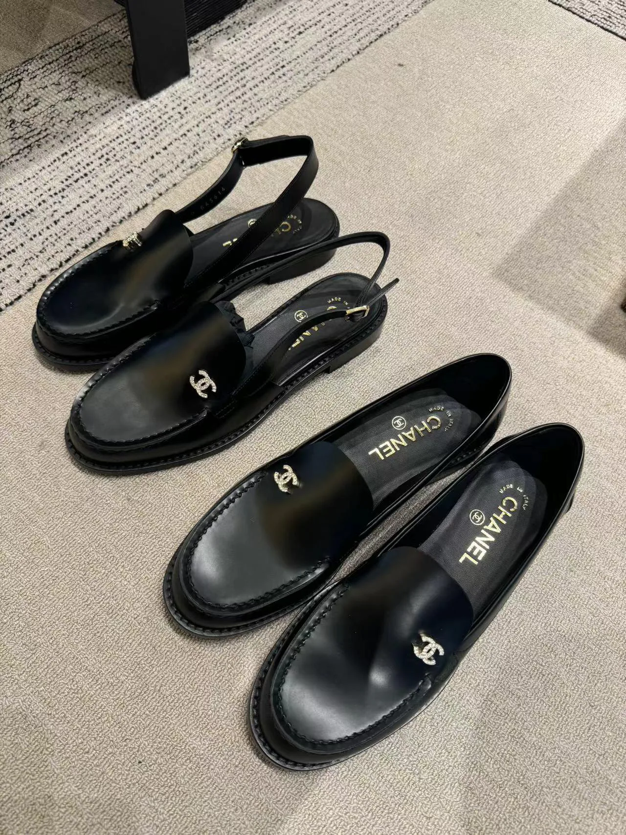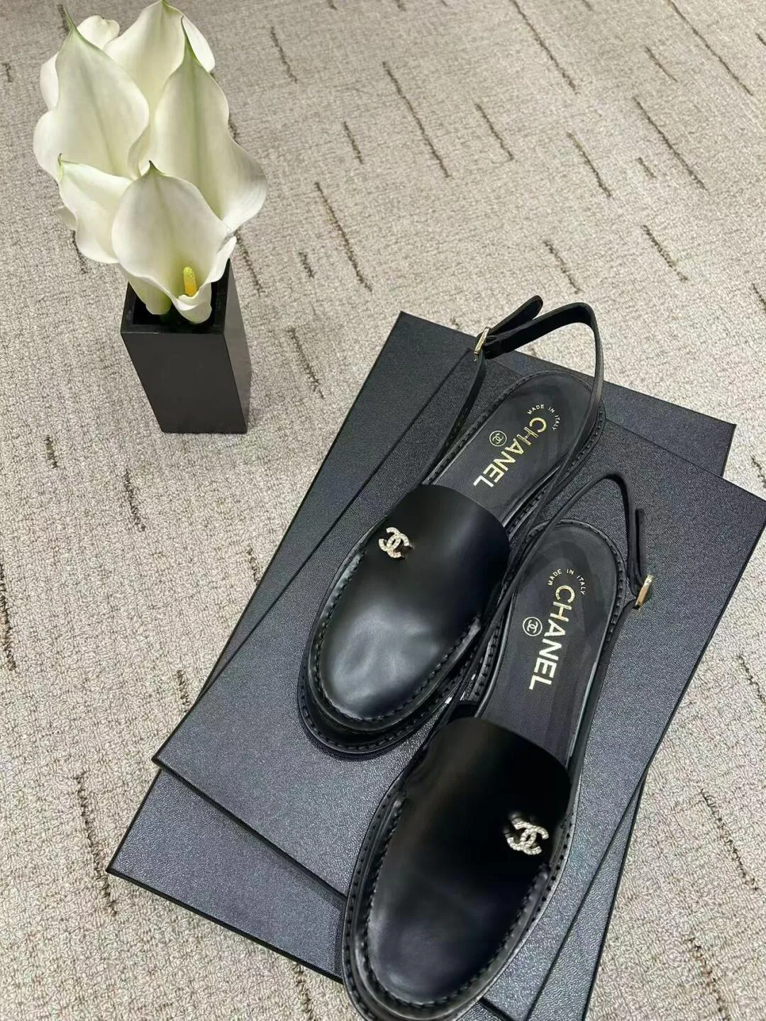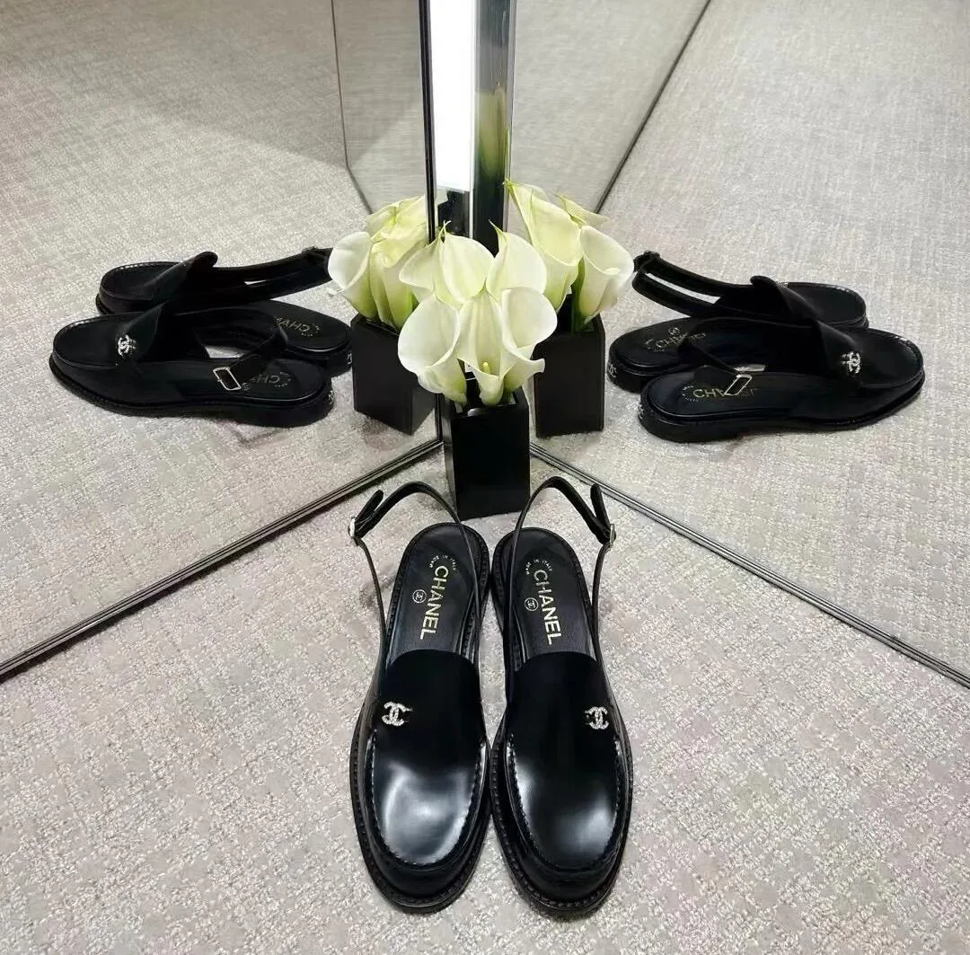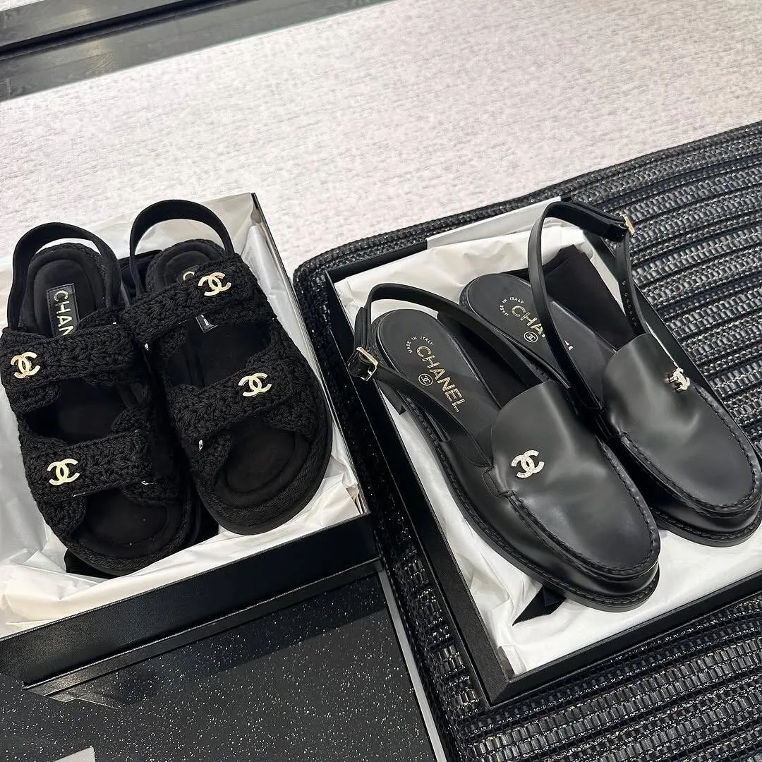 Вторая пара — чёрные кожаные босоножки с открытым носом и закрытой пяткой. Фиксация на щиколотке осуществляется ремешком с пряжкой, что обеспечивает надёжную поддержку и стильный вид. Логотип Chanel размещён на обуви, подчёркивая престиж и классический стиль. Босоножки универсальны и прекрасно вписываются в гардероб для различных мероприятий — от повседневных встреч до более формальных ужинов.