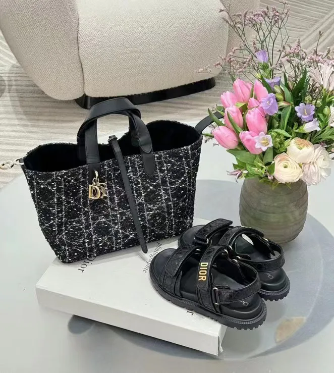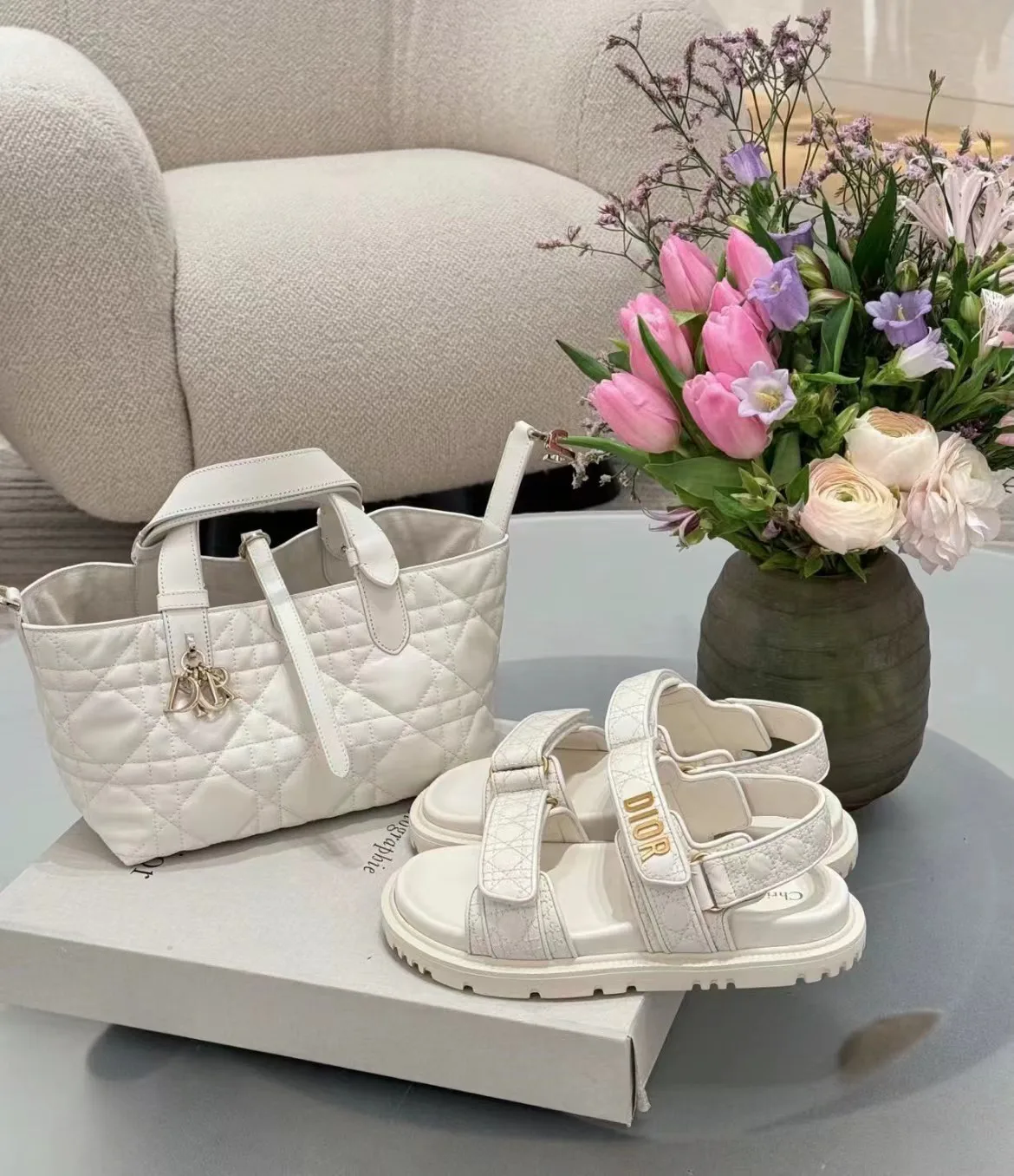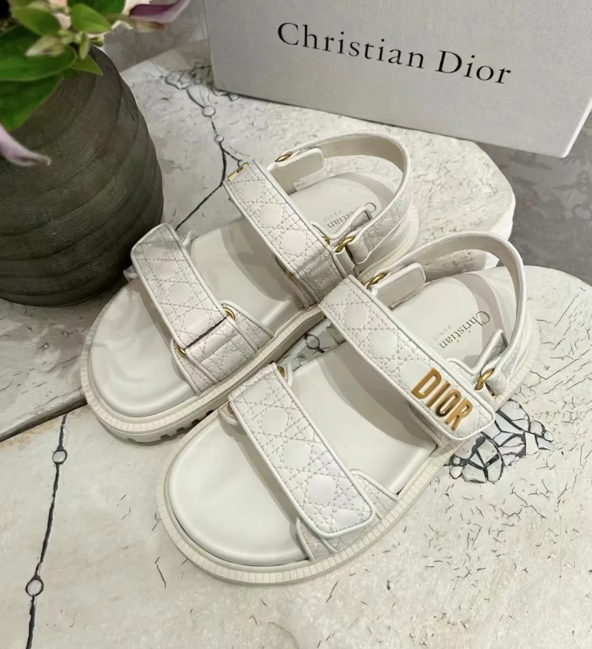 Верх сандалий изготовлен из материала, имитирующего кожу, и украшен характерной стеганой текстурой, которая добавляет глубину образу. На ремешке выделяется металлическая надпись Dior, служащая стильным акцентом.