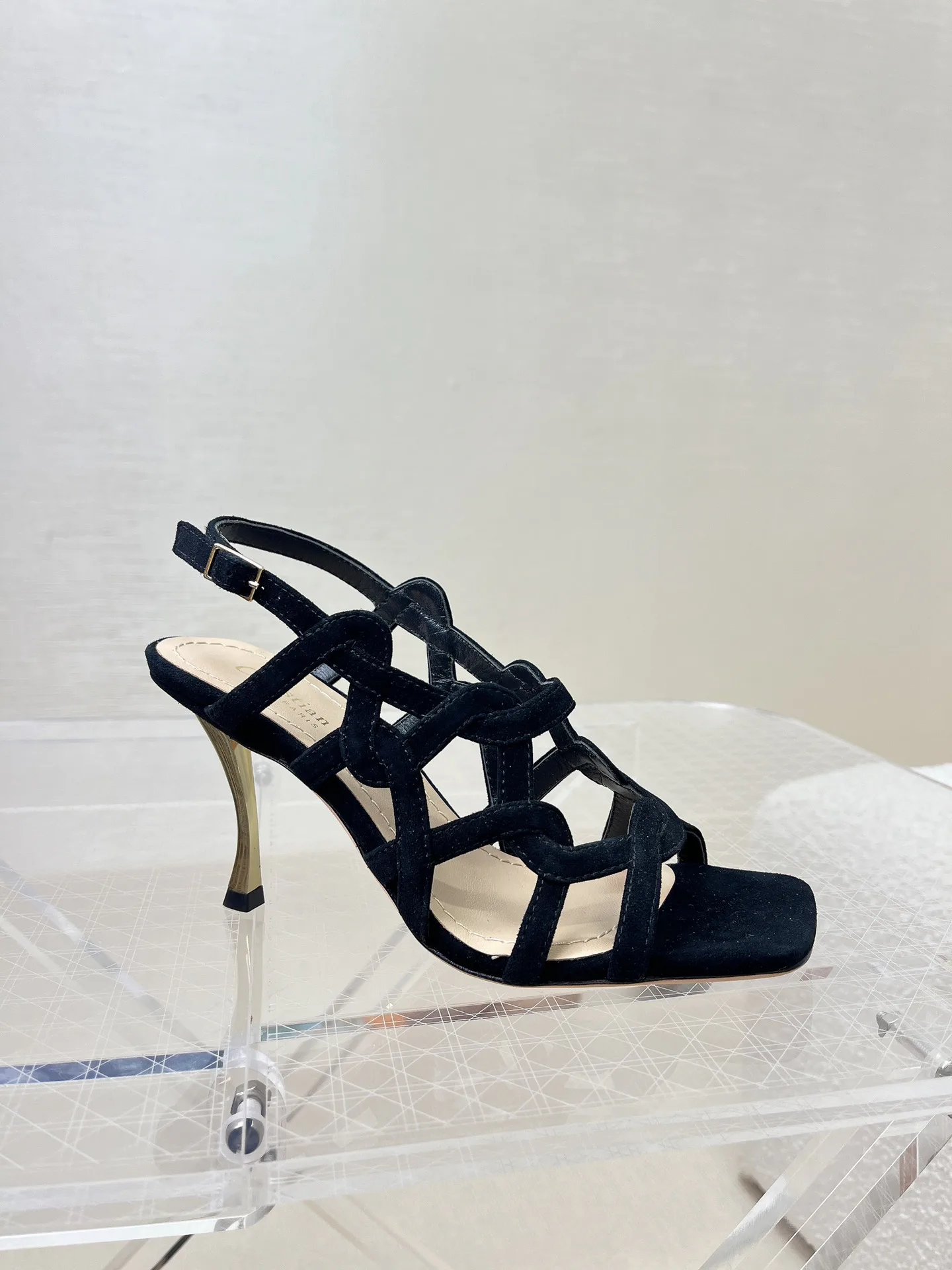 Высокий каблук из металла с золотым покрытием (8 см) подчёркивает архитектурную эстетику и создаёт эффектный силуэт, подходящий и для вечерних нарядов, и для повседневных образов. Сандалии оснащены регулируемой шнуровкой в области щиколотки, обеспечивая надёжную посадку и возможность подстроить обувь под особенности стопы.