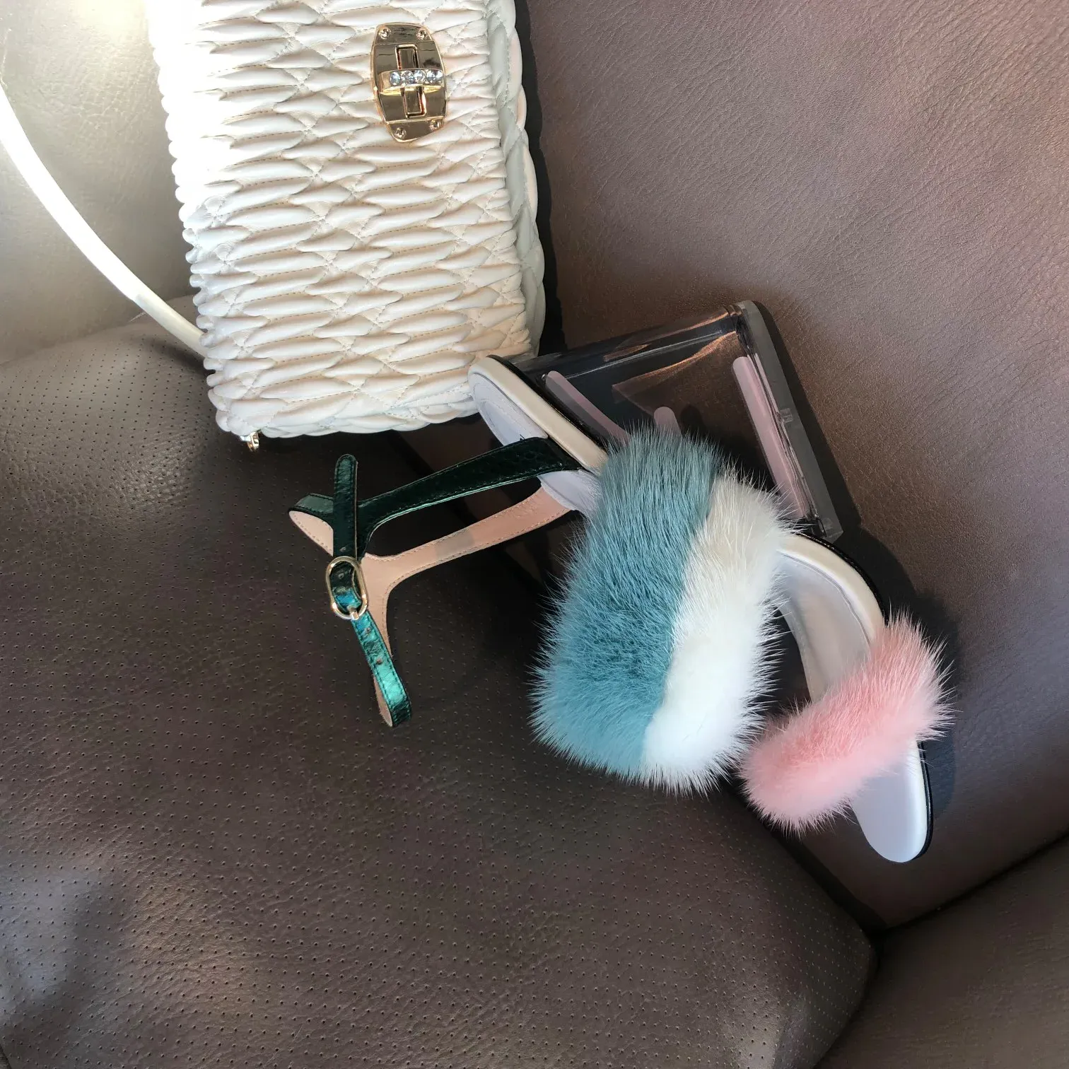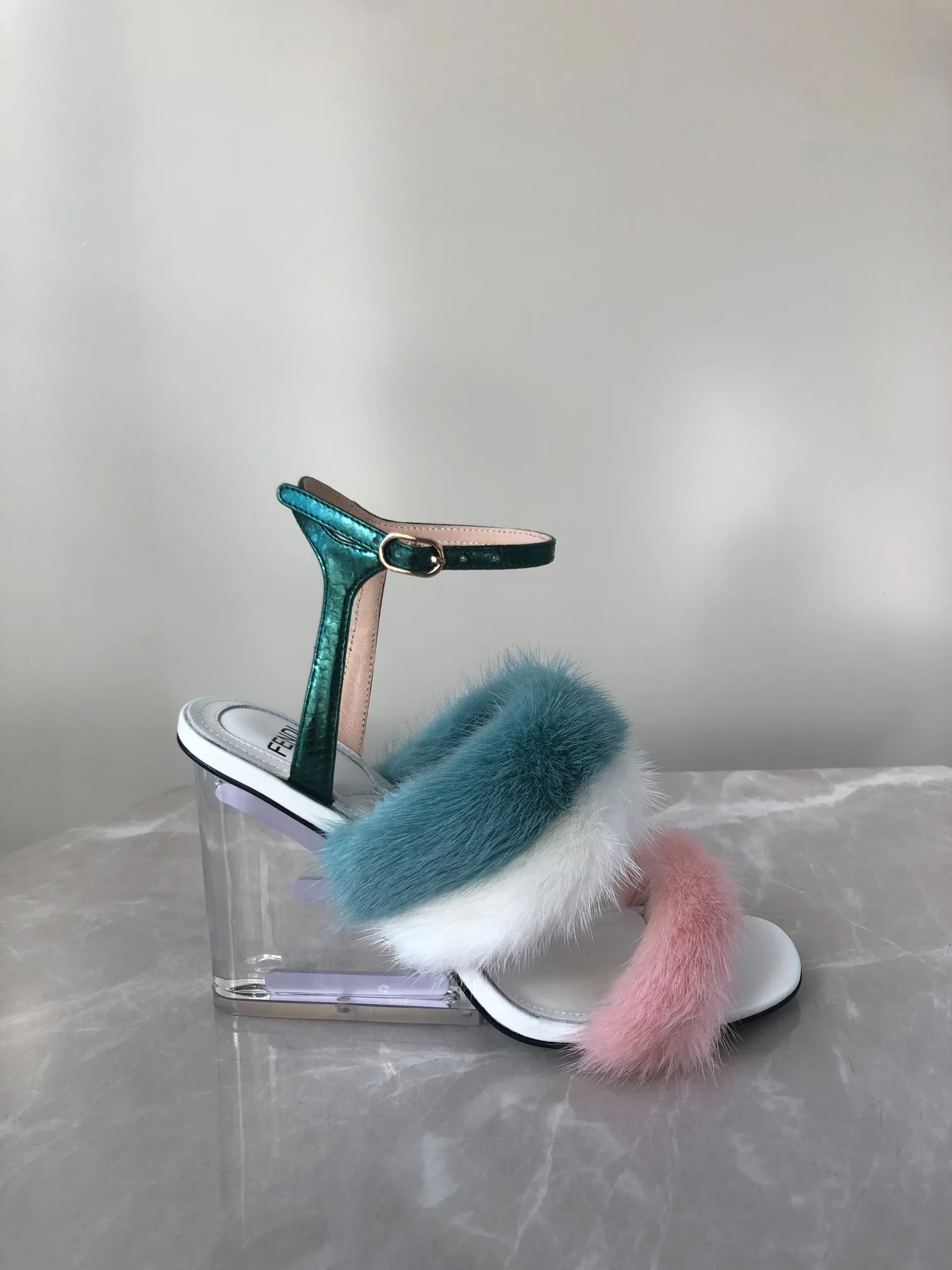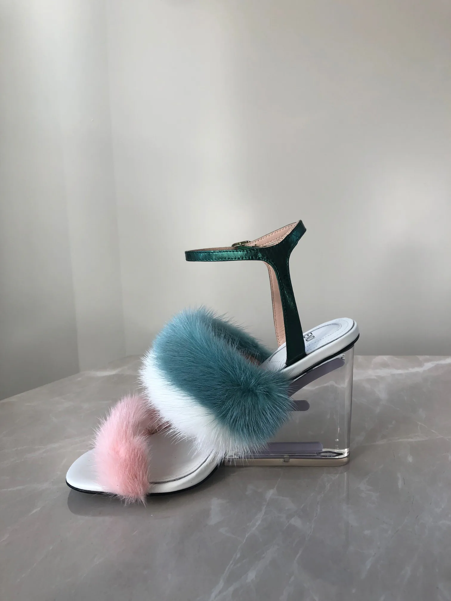 В качестве основных материалов использованы импортные эксклюзивно заказанные норковые меха, которые придают обуви изысканный и элегантный вид. Интерьер сандалий выполнен из водорастворимой овчины, а подошва — из настоящей натуральной кожи, что обеспечивает долговечность и комфорт.
