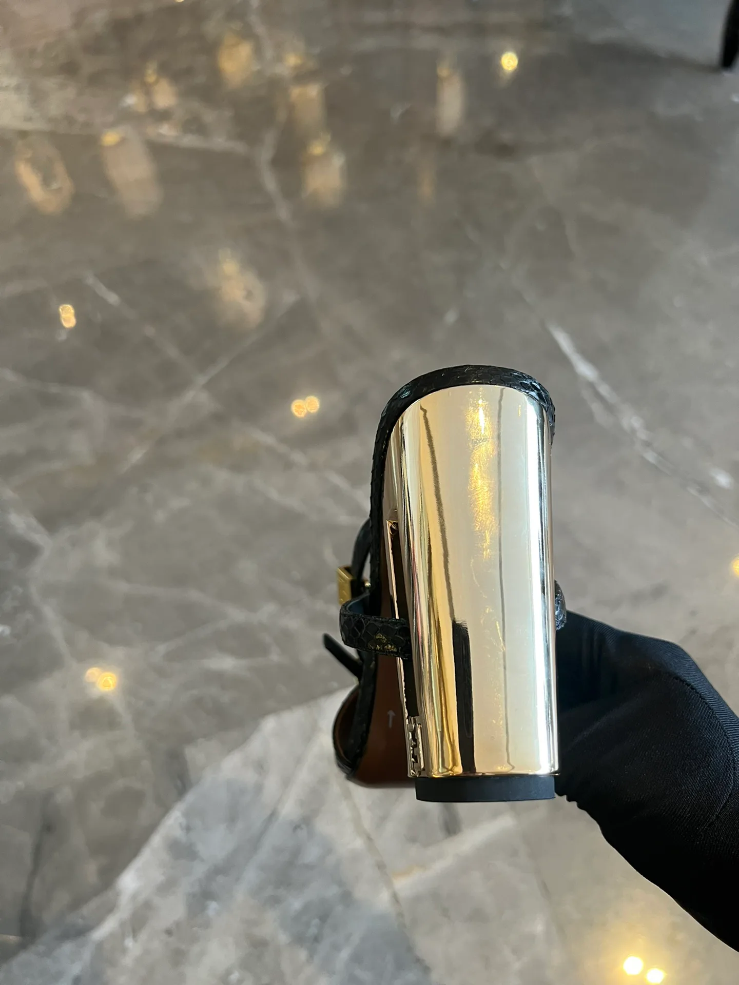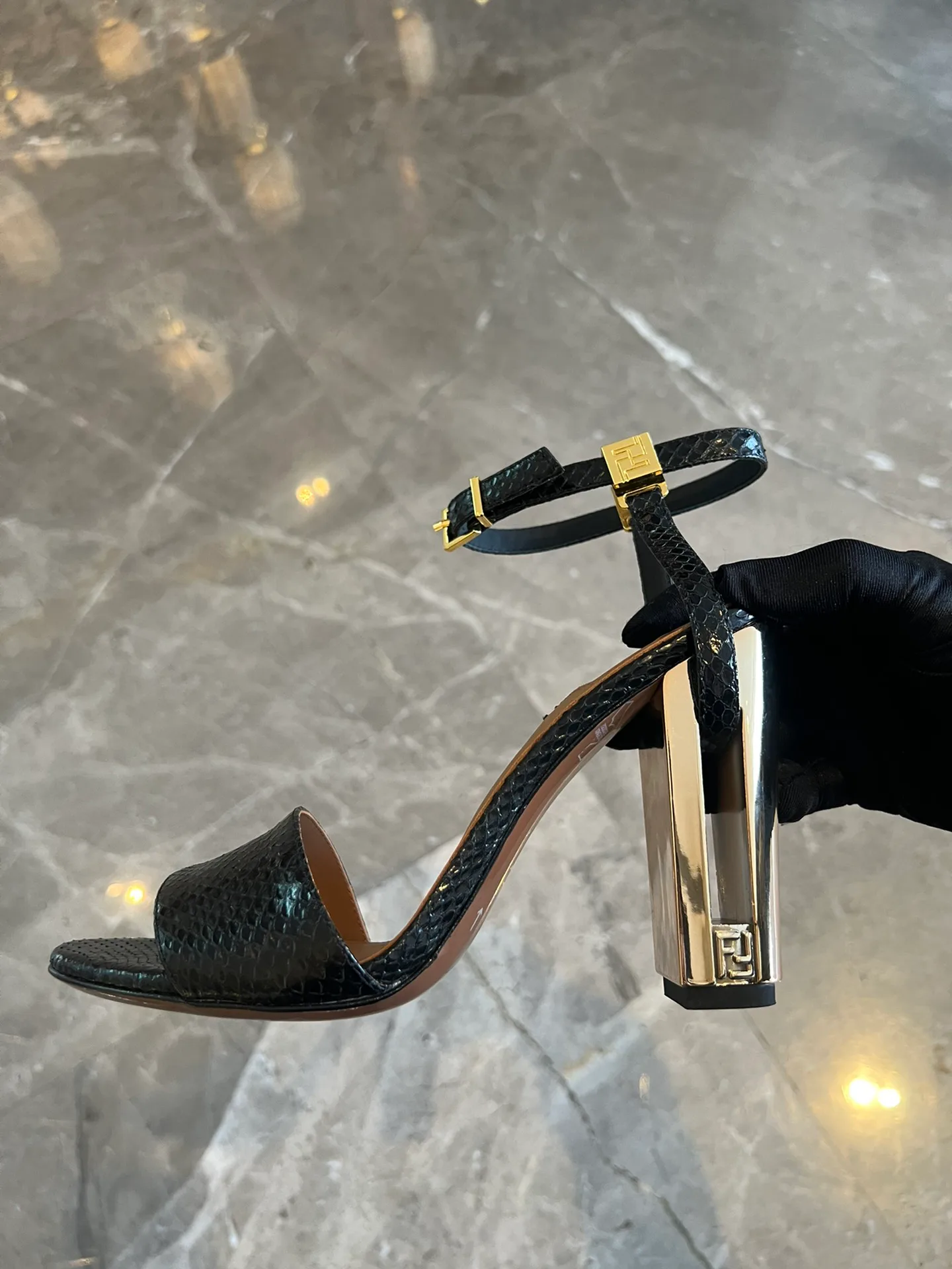 Верхняя часть выполнена из импортной змеиной кожи, что придает ей роскошный вид. Подкладка и стелька изготовлены из водоотталкивающей натуральной кожи, обеспечивая комфорт при носке. Сандалии украшены застежками с логотипом FF, которые можно снять. Подошва из натуральной кожи, каблук украшен изысканной резьбой и золотыми элементами с логотипом FF.