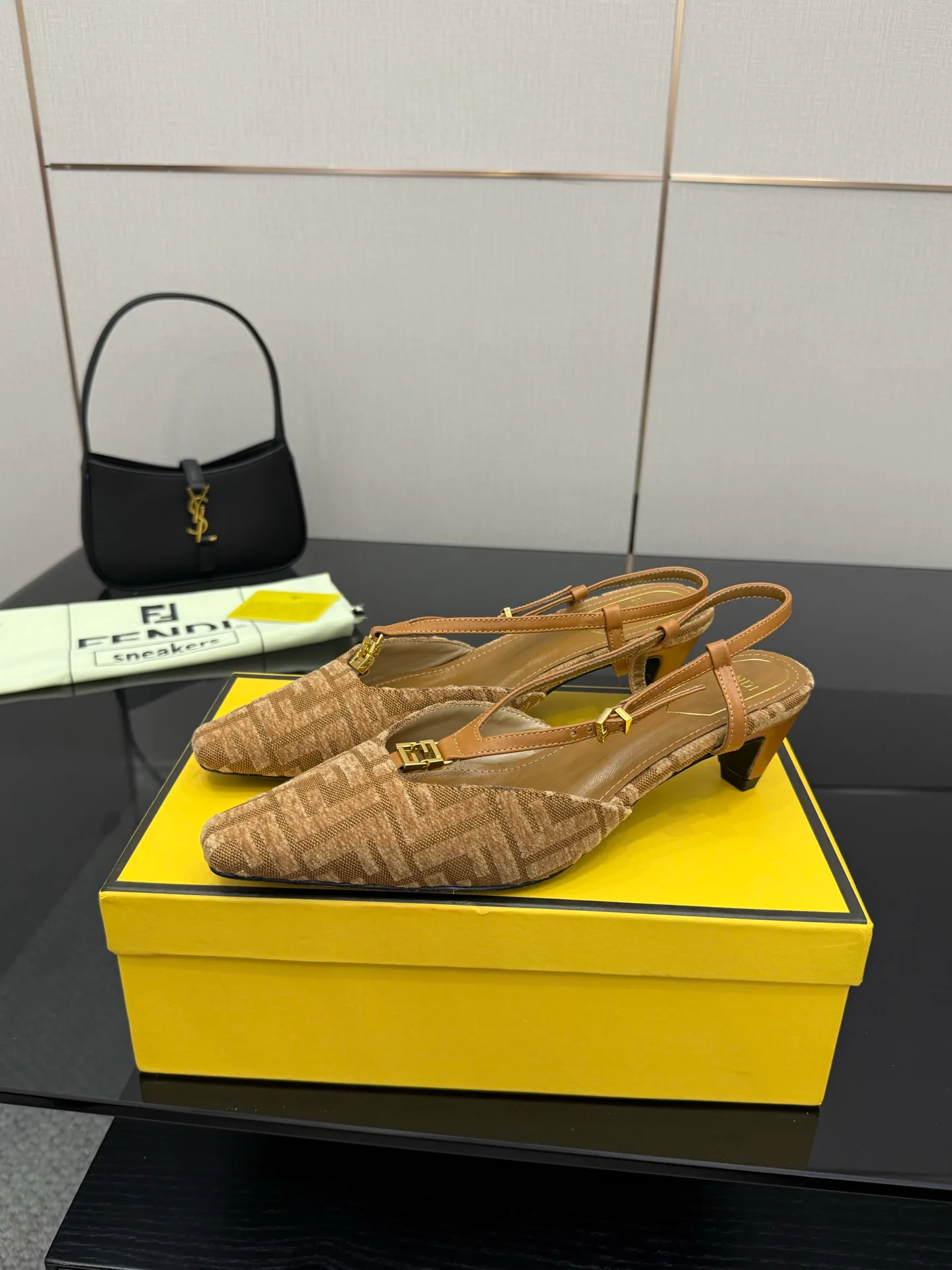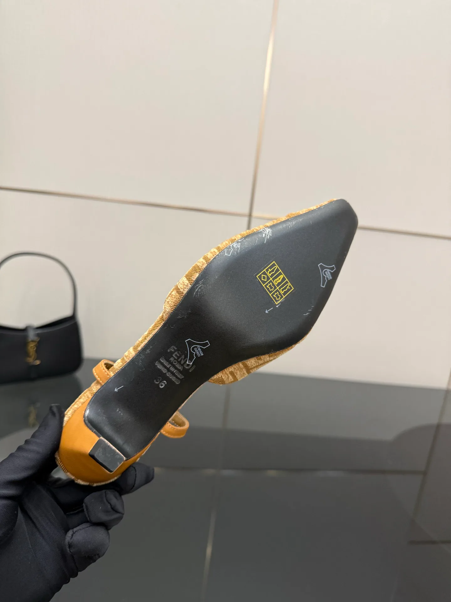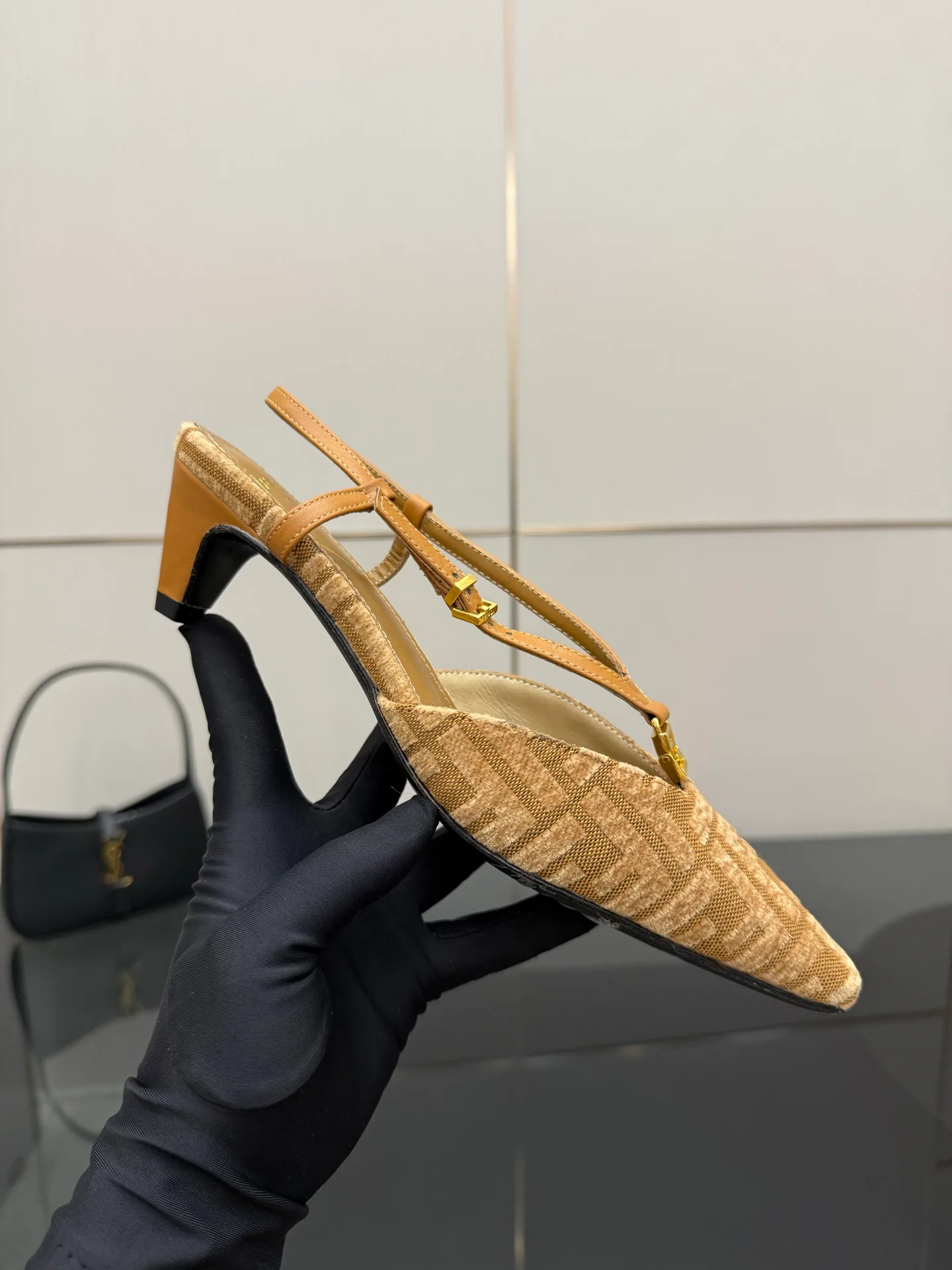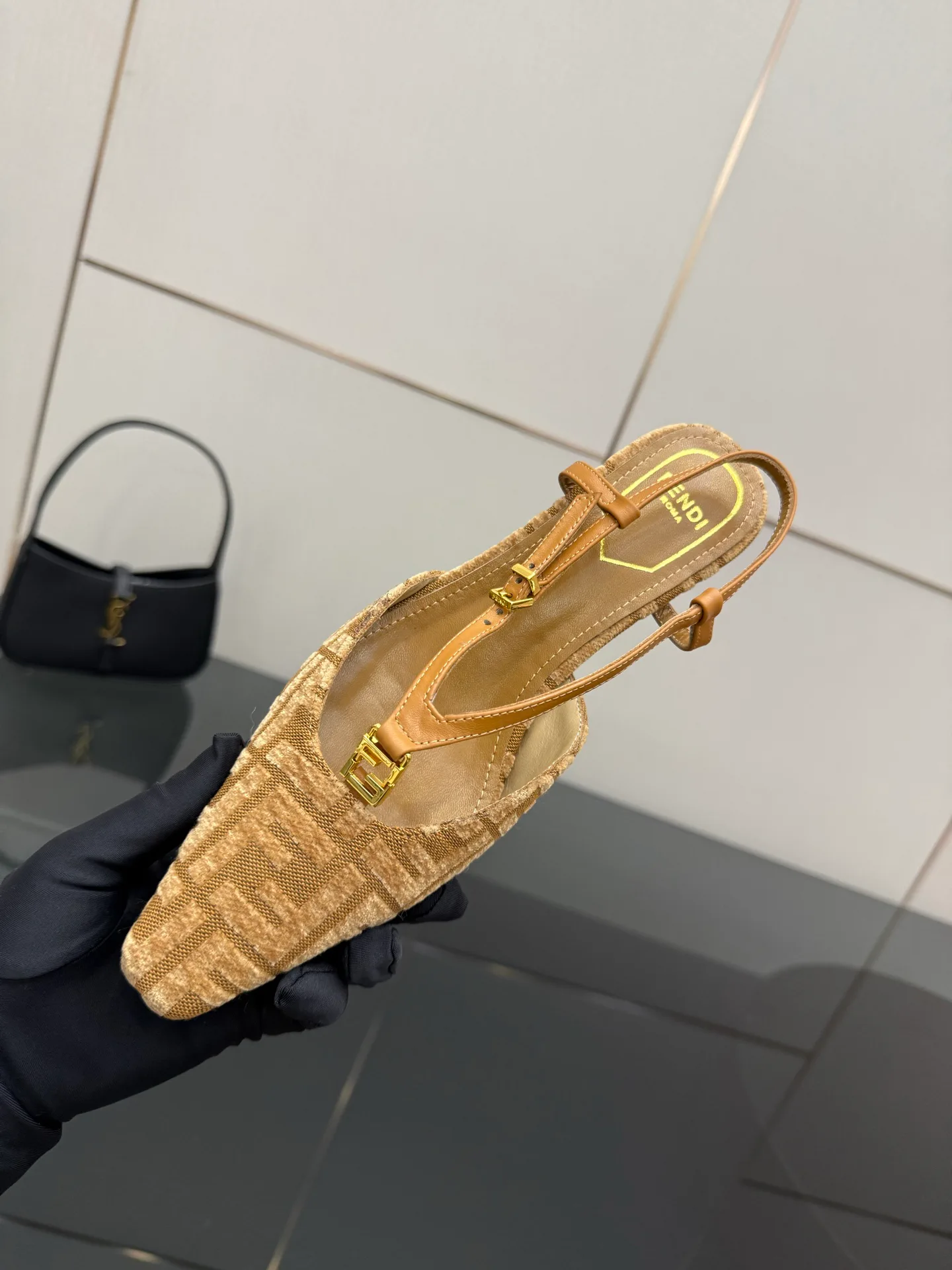 Туфли имеют оригинальные завязки, которые красиво обвивают ногу, добавляя акцент стилю. Металлическая брошка в виде логотипа FF служит изысканной деталью и подчёркивает бренд Fendi. Модель отличается уникальным дизайном с функциональной центральной петлей, что делает обувь красивой и удобной в носке.