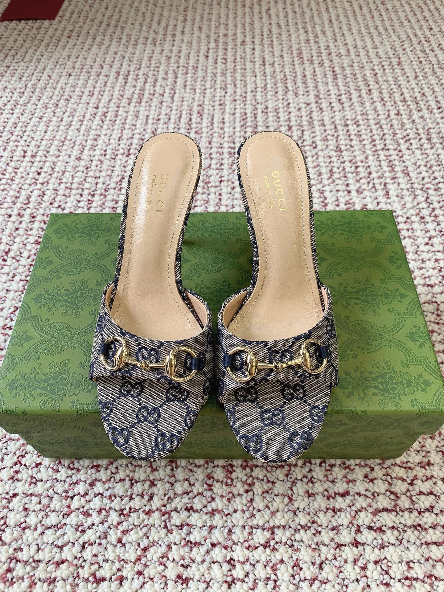Босоножки женские GUCCI — модель с открытой пяткой и мысом на тонком высоком каблуке. Верх выполнен из фактурной кожи ягнёнка и ткани с фирменным узором. Подошва изготовлена из натуральной кожи. Высота каблука составляет 8.5 сантиметров.