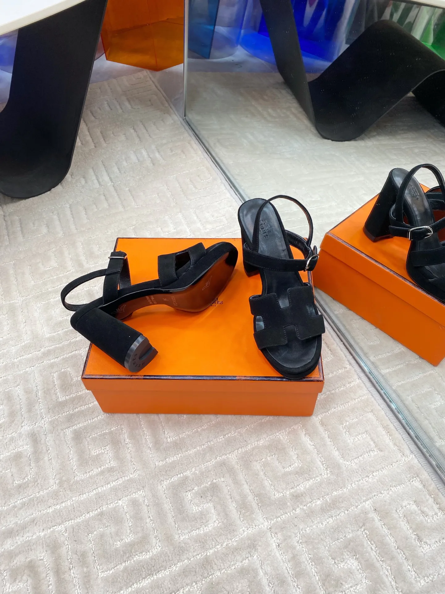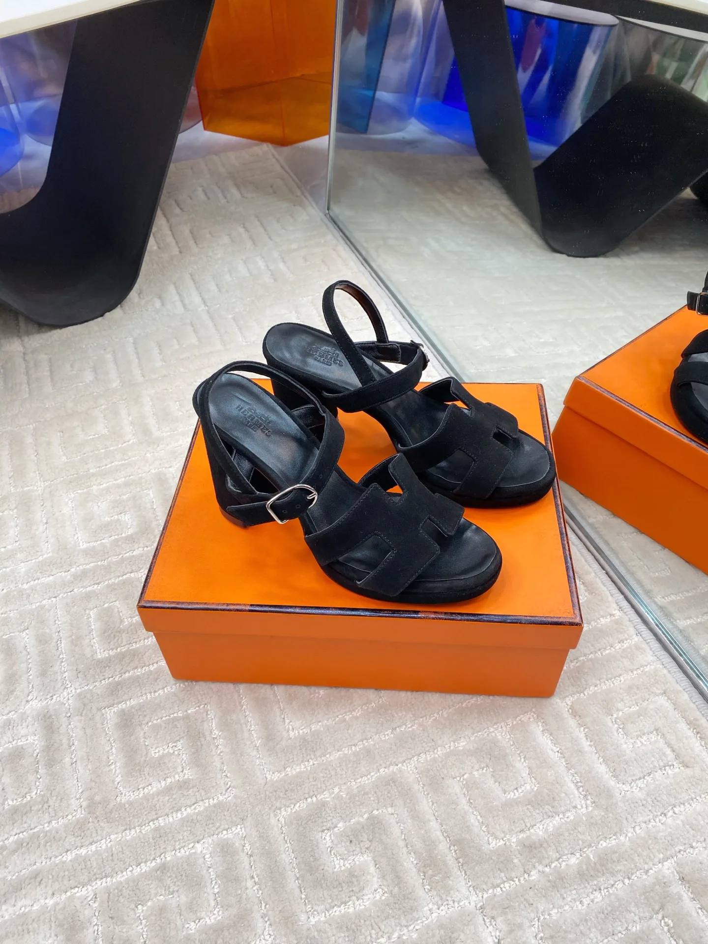 Высота каблука около 9 см, платформа около 2 см, что формирует эффектный силуэт без потери удобства. Дизайн подчёркивает щиколотку за счет уникального крепления на щиколотке. Пряжка в форме H добавляет нотки утончённости и стиля.
