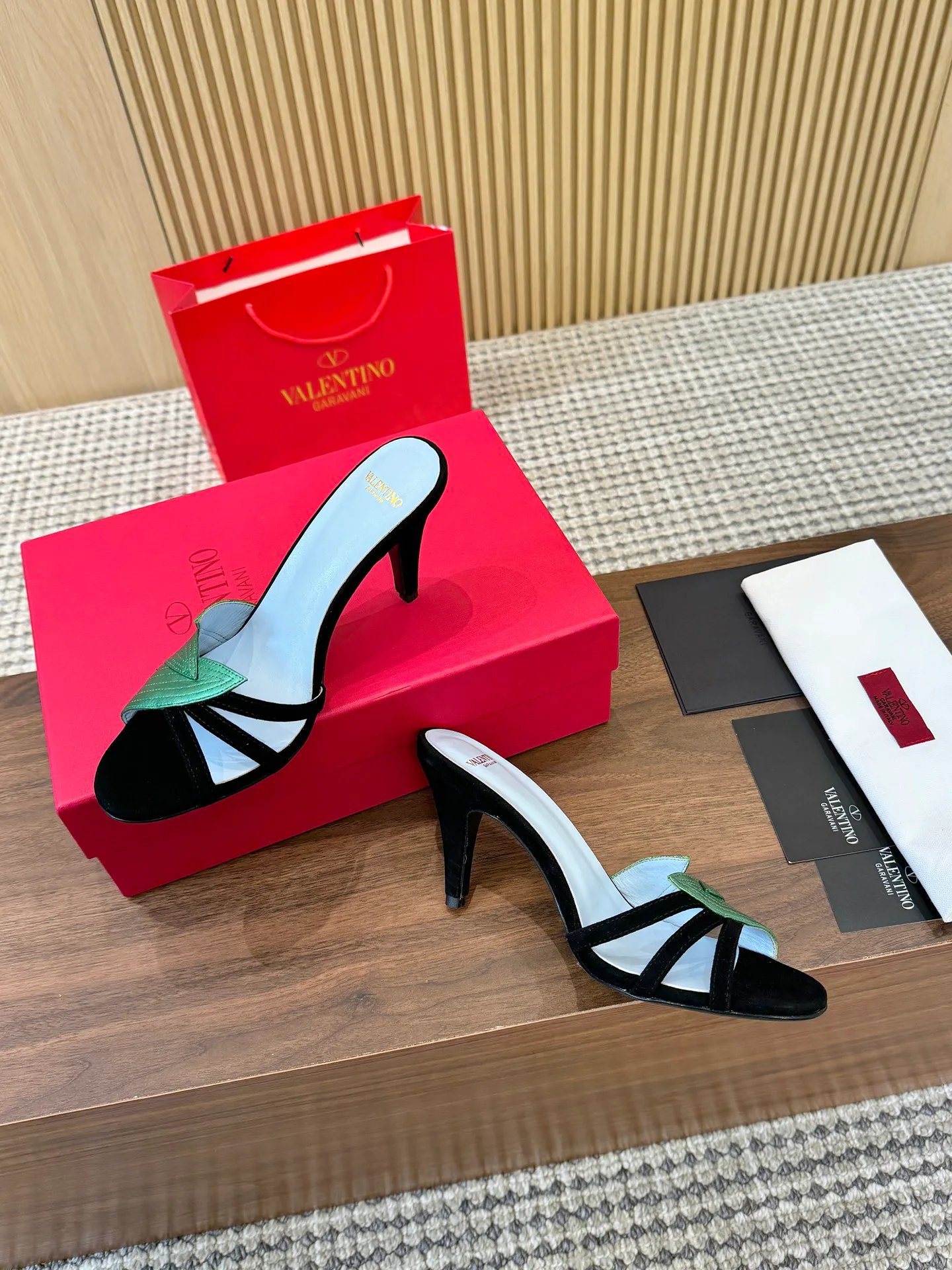 Босоножки женские VALENTINO — это модель с открытой пяткой из новой весенне-летней коллекции. Дизайн украшен уникальной аппликацией в виде листьев, что создаёт элегантный и современный образ. Модель выполнена из комбинации импортной замши и металлизированной кожи, с внутренней отделкой из натуральной овчины. Удобная колодка с высотой каблука около 8 сантиметров обеспечивает комфорт при ходьбе.
