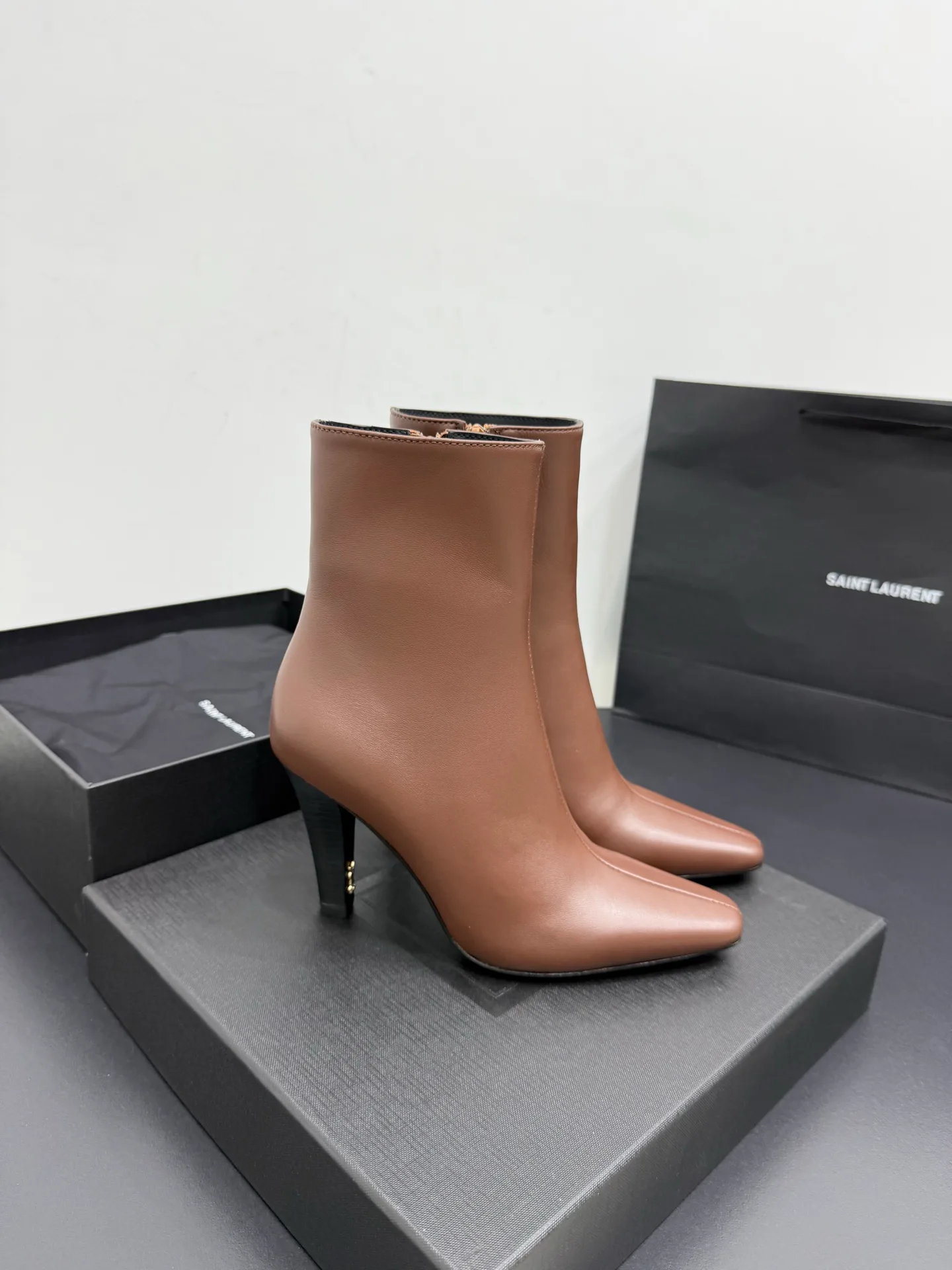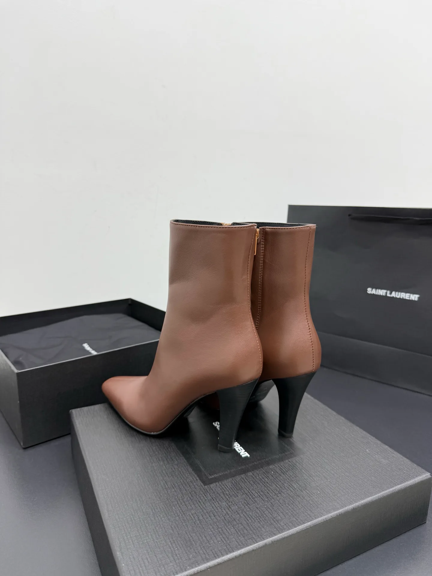 Верх из натуральной кожи представлен в вариантах коровьей и олений кожи. Подкладка и стелька выполнены из овечьей кожи, а подошва – из итальянской натуральной кожи. Высота каблука составляет 9 см, что добавляет изящества образу. Конструкция голени спроектирована с учётом формы ноги, обеспечивая утончённый силуэт.